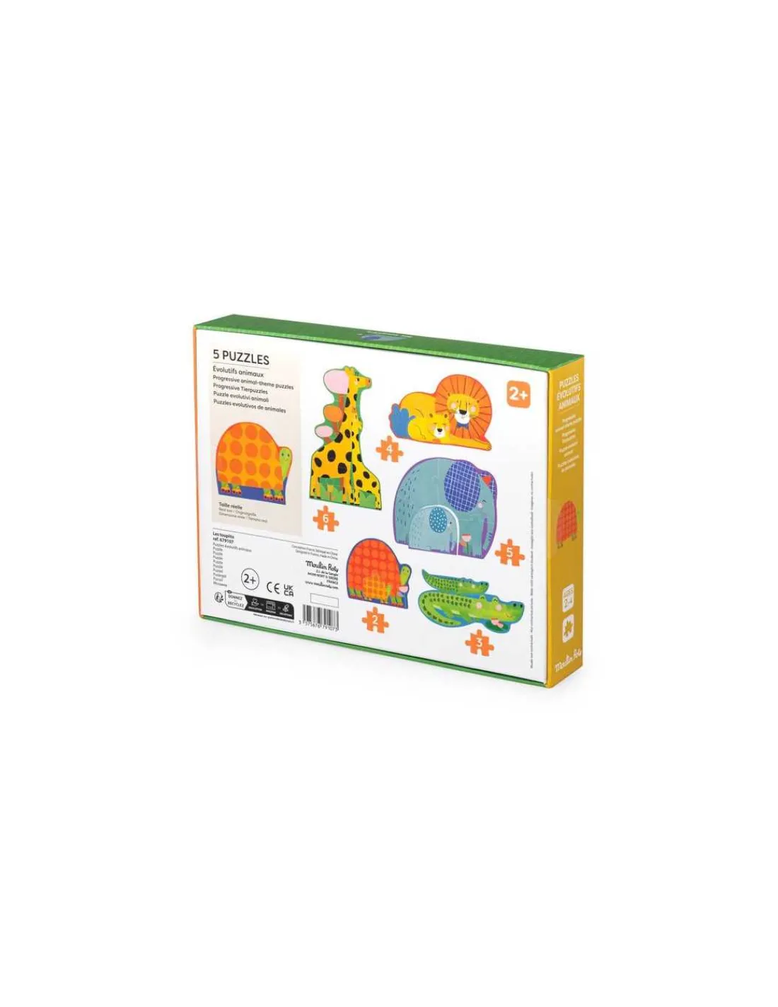 Bienvenue dans le monde coloré des Toupitis ! 5 puzzles en carton de 2 à 6 pièces, faciles à réaliser et parfaits pour apprendre à compter. Des puzzles évolutifs à partir de 2 ans et jusqu’à 4 ans avec des animaux : lion, éléphant, girafe, crocodile et tortue.