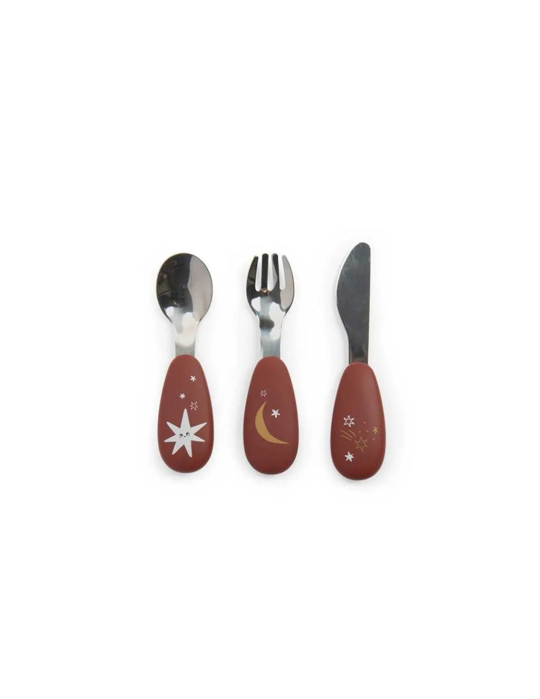 Ce set comprend trois couverts en inox et silicone, spécialement conçus pour offrir une prise en main facile et confortable, permettant ainsi aux tout-petits de manger comme les grands. Le set contient une cuillère, une fourchette et un couteau à bout rond, parfaitement adaptés aux petites mains. Chaque couvert est joliment illustré aux couleurs de la collection, avec de jolies étoiles et une lune.