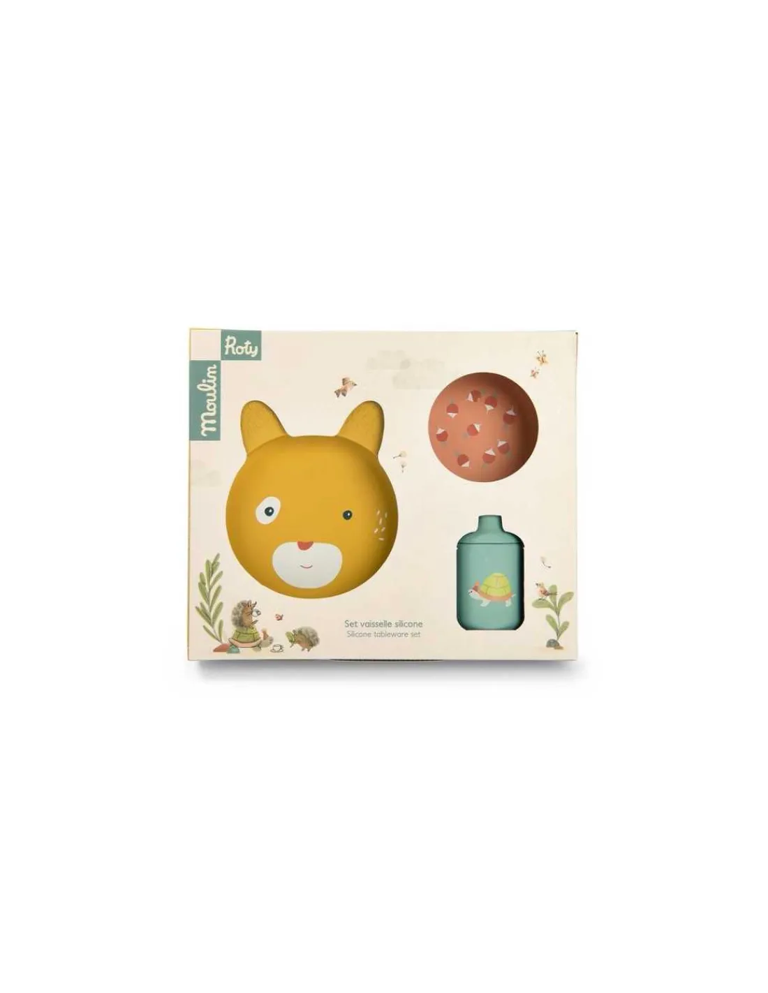 Découvrez le set de vaisselle en silicone de la collection Trois Petits Lapins de Moulin Roty, un coffret vaisselle tendre et ludique, parfait pour accompagner bébé dans l’étape importante de la diversification alimentaire.