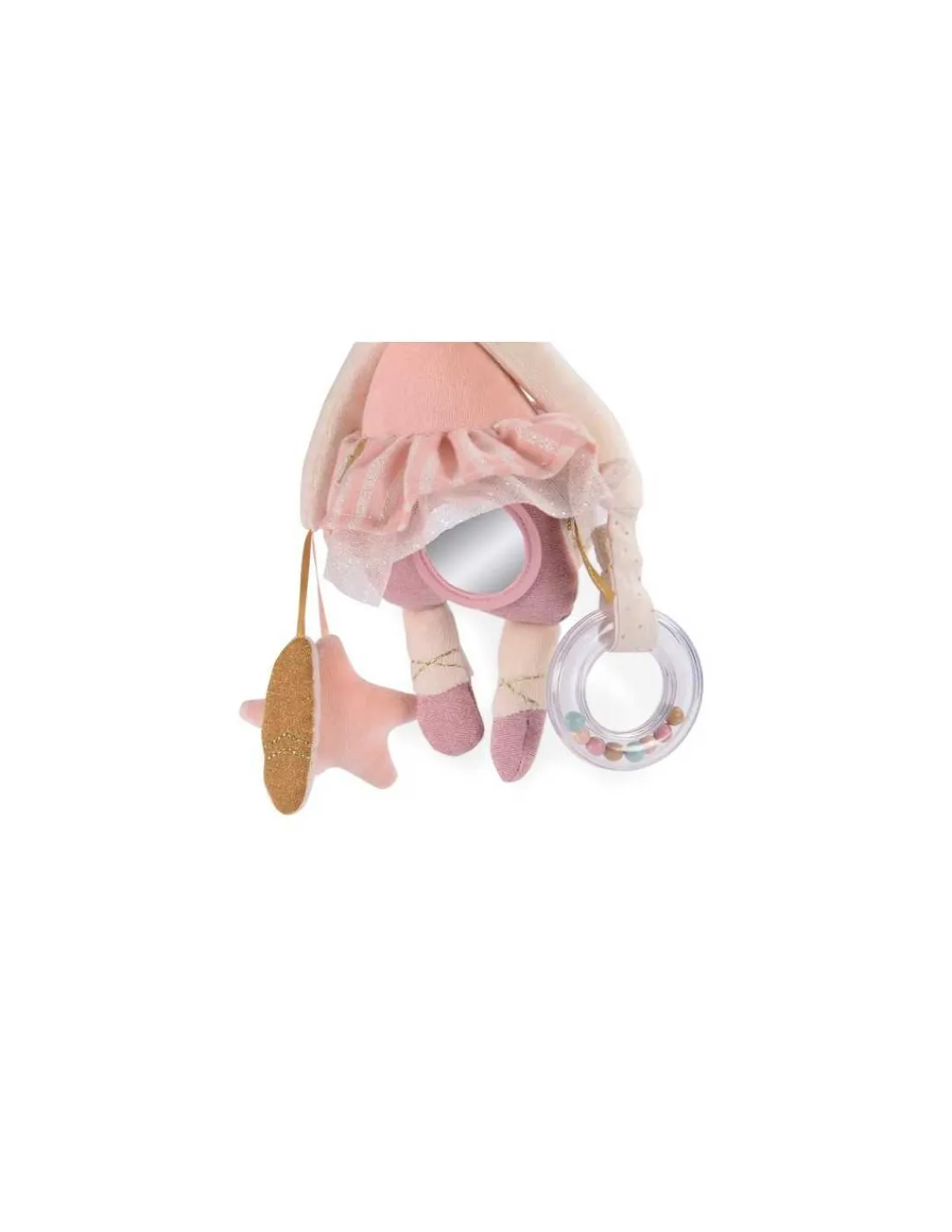 Une souris d’activités à suspendre qui transporte avec elle plein de surprises pour éveiller bébé! Elle tient dans ses pattes, un anneau à billes, une étoile qui fait dilling, une feuille au bruit de papier froissé et cache un miroir sous son tutu…