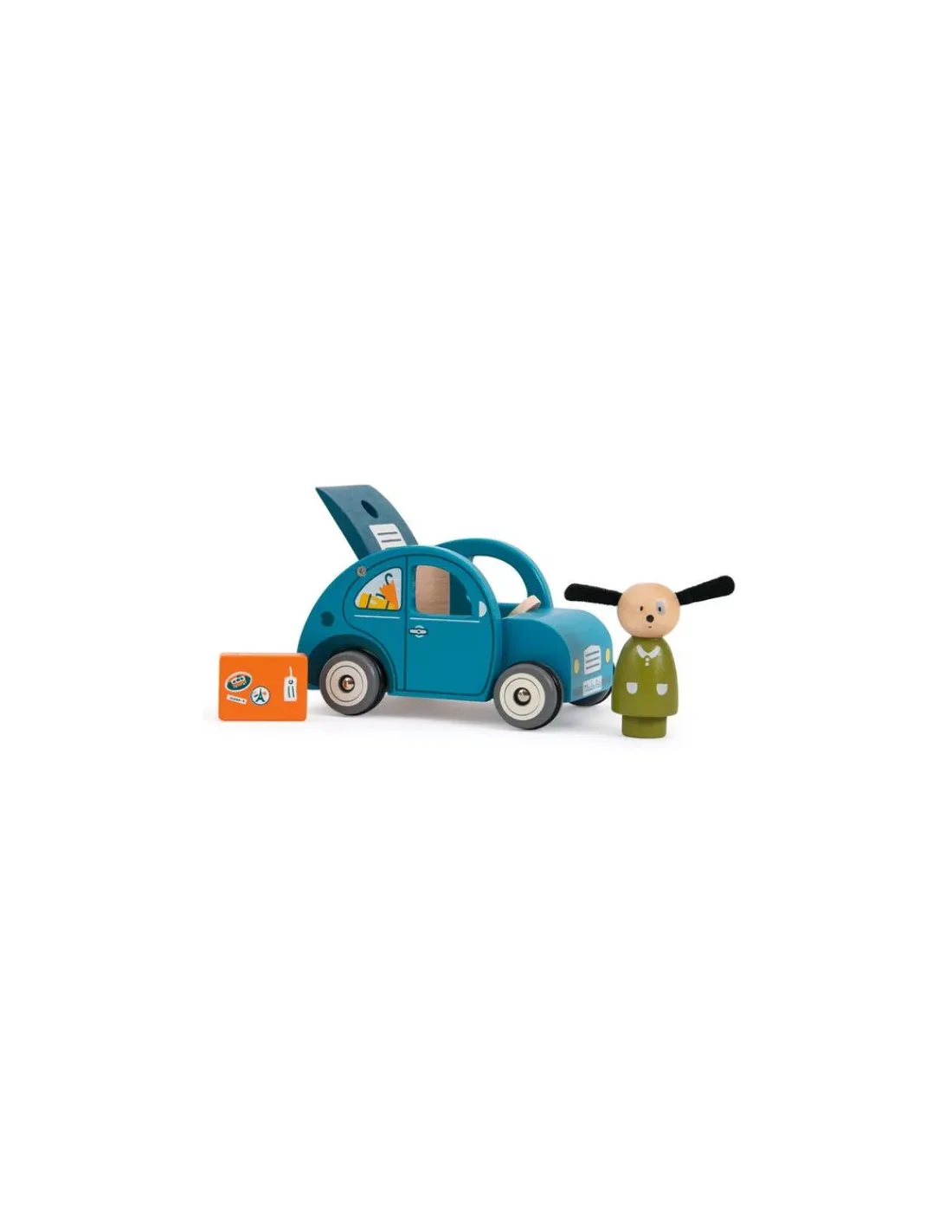 Julius le chien part en week-end au volant de sa belle voiture décapotable! Elle est en bois sérigraphié avec un coffre ouvrable pour y ranger sa valise. La voiture week-end peut être associée à la caravane de la même collection.