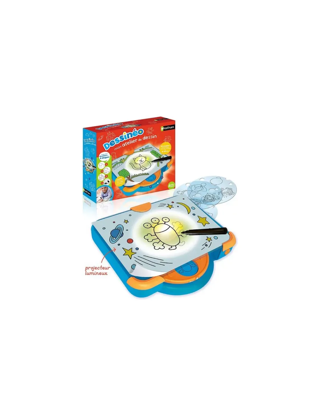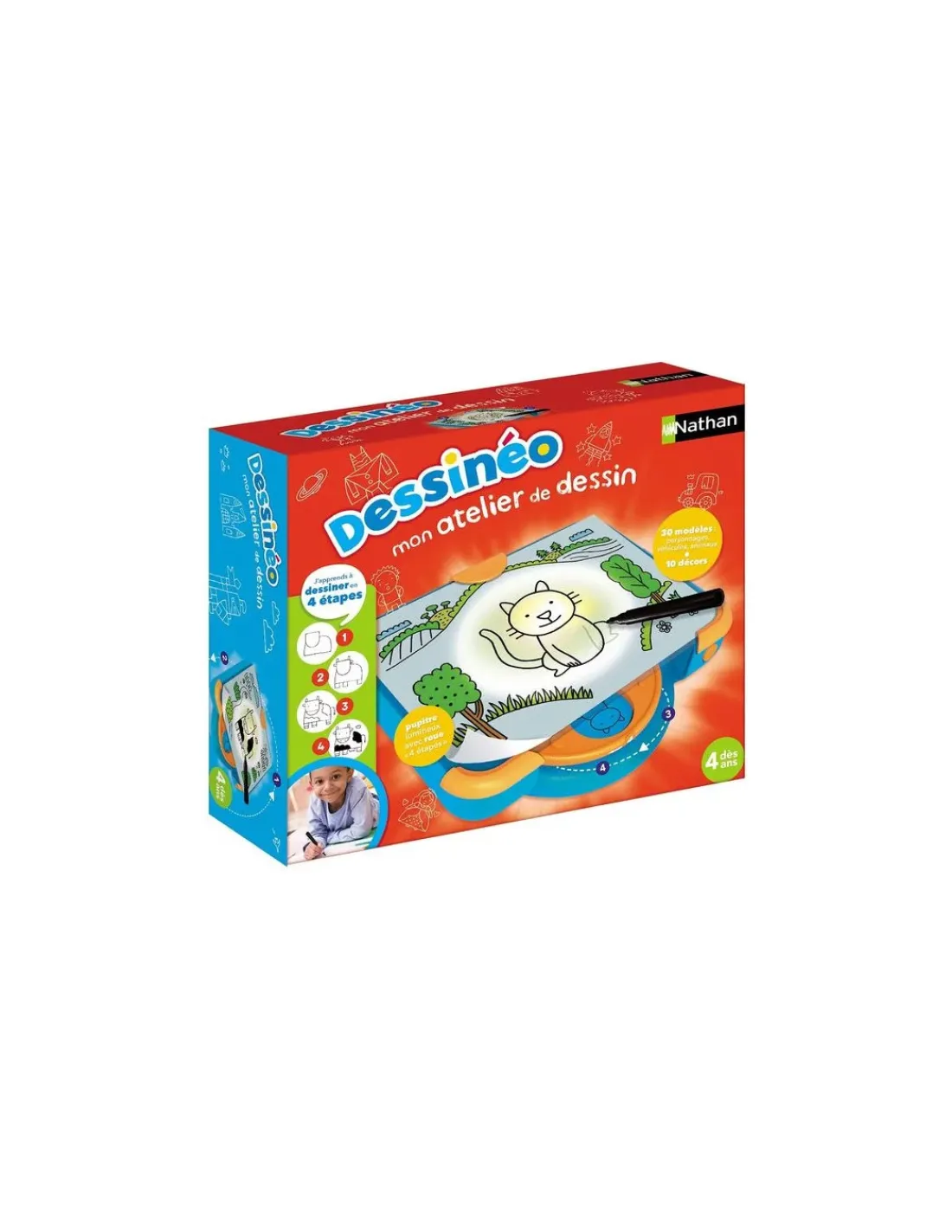 Découvrez Dessinéo mon atelier de dessin de Nathan, un premier jeu pour apprendre à dessiner à partir de 4 ans. En 4 étapes et grâce à un pupitre lumineux, apprends à réaliser 30 modèles de dessin et 10 décors. Un jeu d’apprentissage du dessin éducatif, dans une mallette à emporter partout.