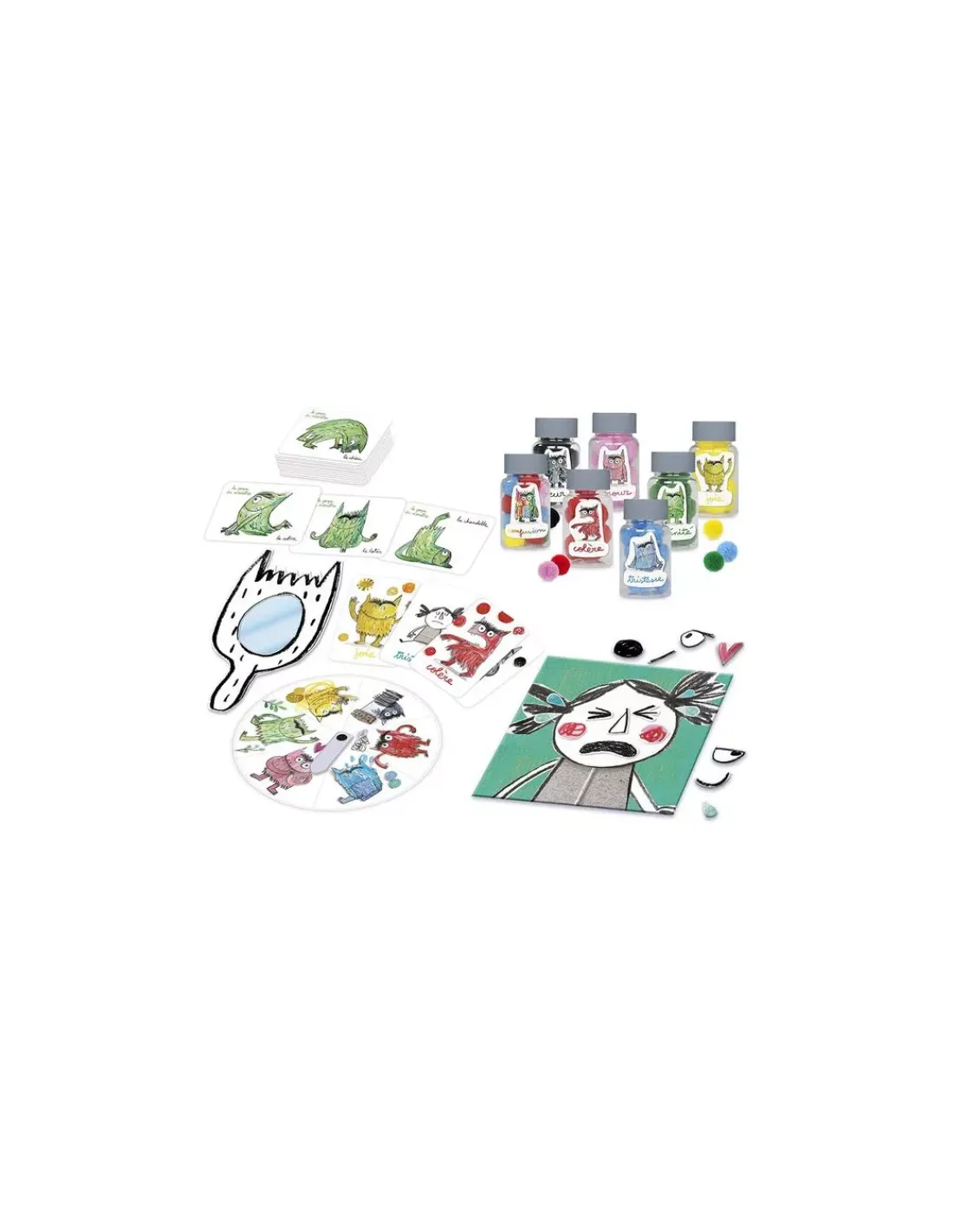 Le jeu contient 14 grandes cartes découverte (11 x 16,5 cm), 1 roue des émotions (diamètre 19 cm) avec flèche tournante, 1 miroir (9 x17 cm), 7 flacons (hauteur 8 cm) avec étiquettes à coller et une centaine de pompons (20 de chaque couleur), 1 tableau magnétique (20 x 19 cm) et 33 magnets, 10 grandes cartes yoga (11 x 16,5 cm), 1 guide de 20 pages.