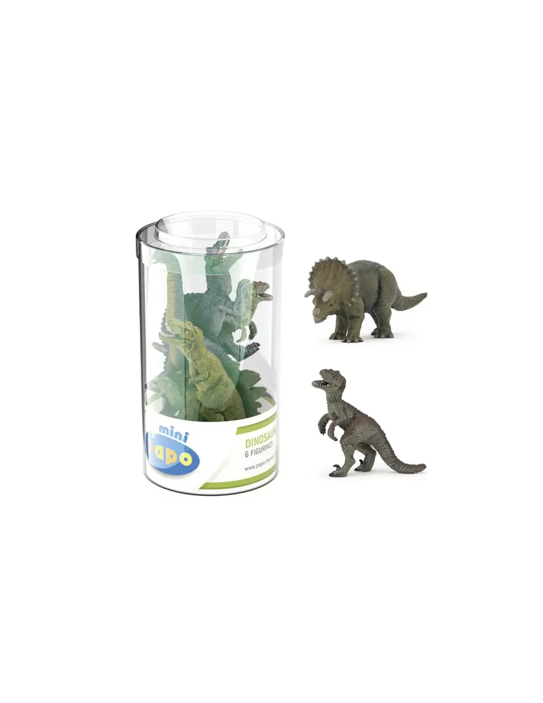 Découvrez les 6 mini figurines dinosaures Papo, 6 dinosaures miniatures pour les enfants dès 3 ans. Un coffret complet avec un vélociraptor, un stégosaure, un spinosaure, un brachiosaure, un T-rex et un tricératops. De petites figurines faciles à transporter partout avec vous afin que votre enfant les aient toujours avec lui.