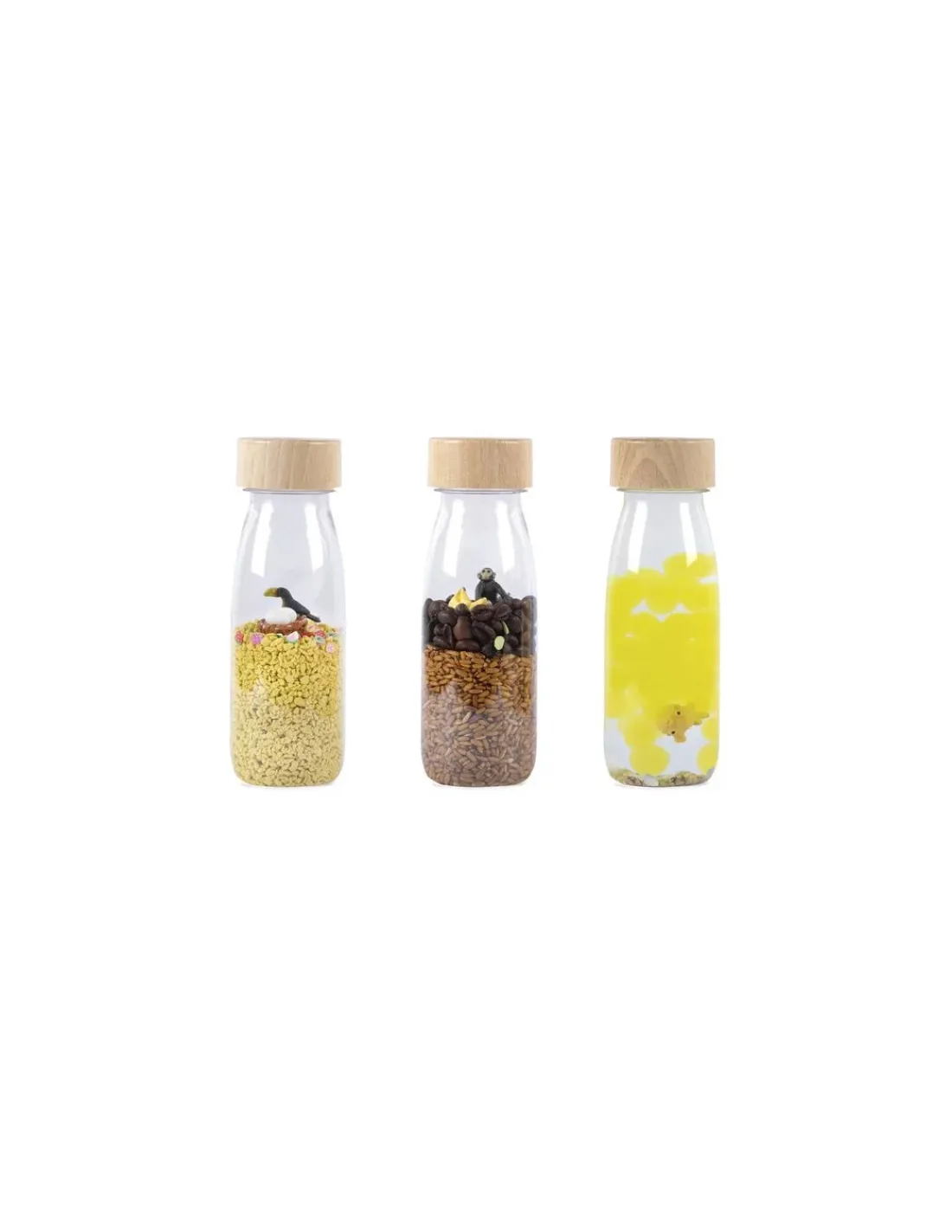 Des bouteilles pour stimuler l’ouïe, la vue et le toucher. Votre enfant va s’amuser à observer les éléments, à agiter les bouteilles, à découvrir des sons, à les faire rouler…