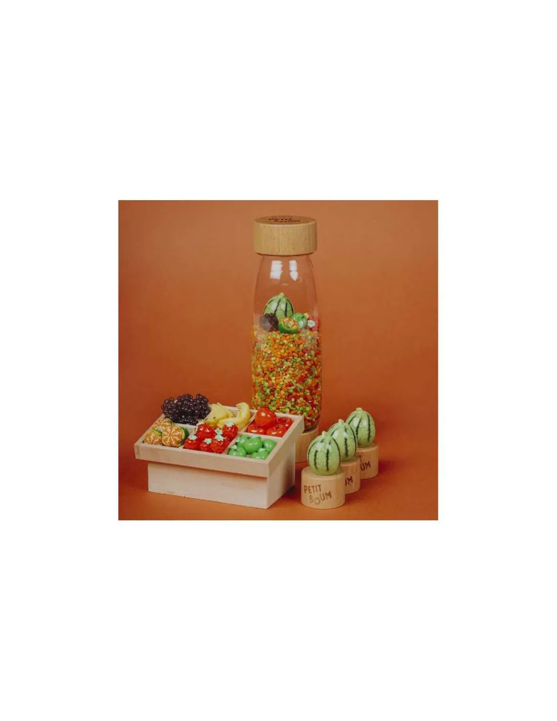 Apprendre à identifier les fruits n’a jamais été aussi amusant, génial dans ce flacon de plaisirs sensoriels en formes et en couleurs. Il suffit de l’agiter et… La récolte est là! Mandarines, raisins secs, bananes, fraises? Choisis ton fruit préféré et ne t’arrête pas avant de les avoir tous trouvés!