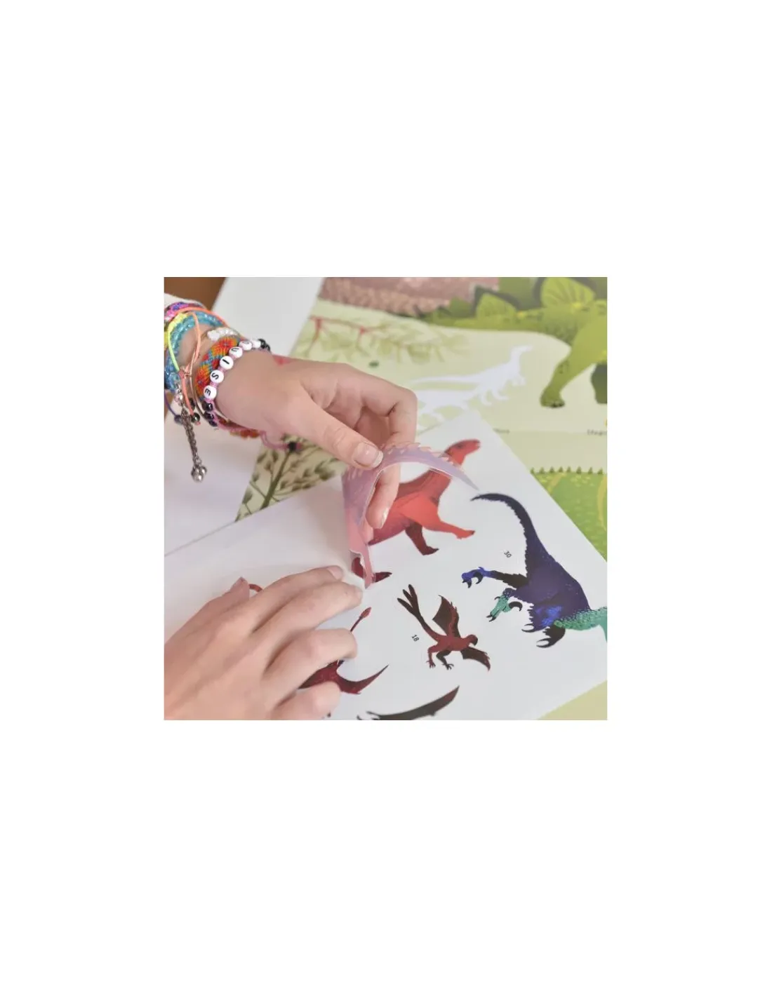 Dépliez le grand poster et collez les différentes espèces de dinosaures : T-rex, Pantydraco, Scelidosaurus… Un code numéroté permet de reconnaître facilement le bon emplacement de chaque animal. L’enfant découvrira le nom de chaque dinosaure, ainsi que la période à laquelle il a vécu : Trias, Crétacé ou Jurassique.