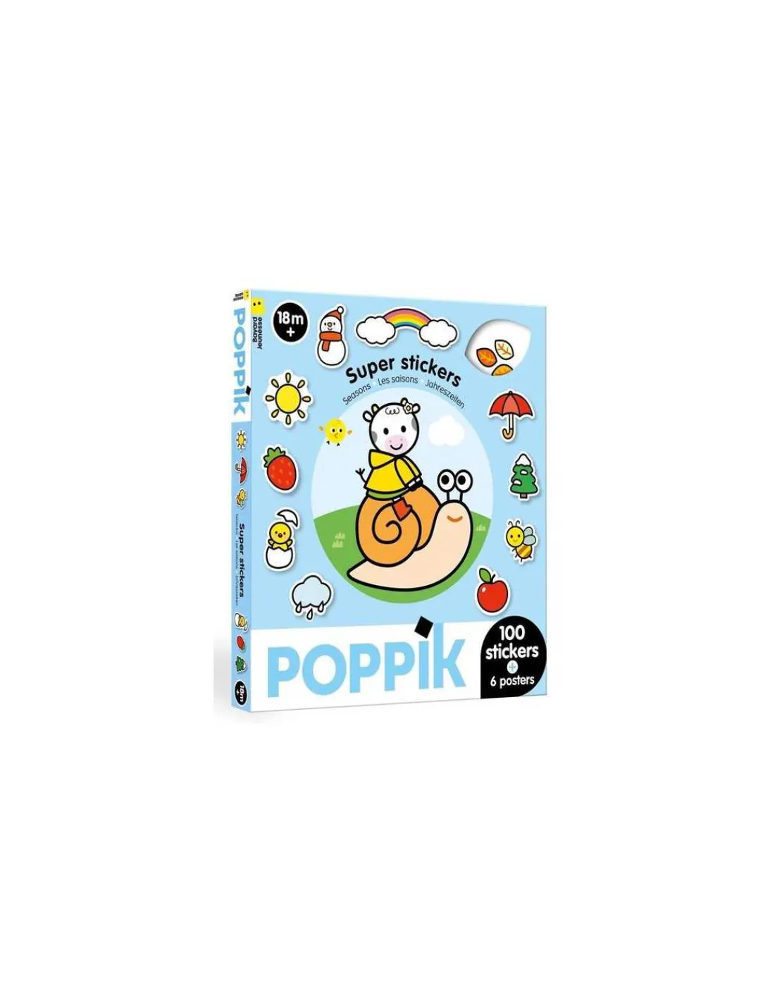 Découvrez le coffret Super stickers Les saisons de Poppik, une activité créative et ludique avec 100 gommettes repositionnables et 6 posters pour les enfants dès 18 mois.