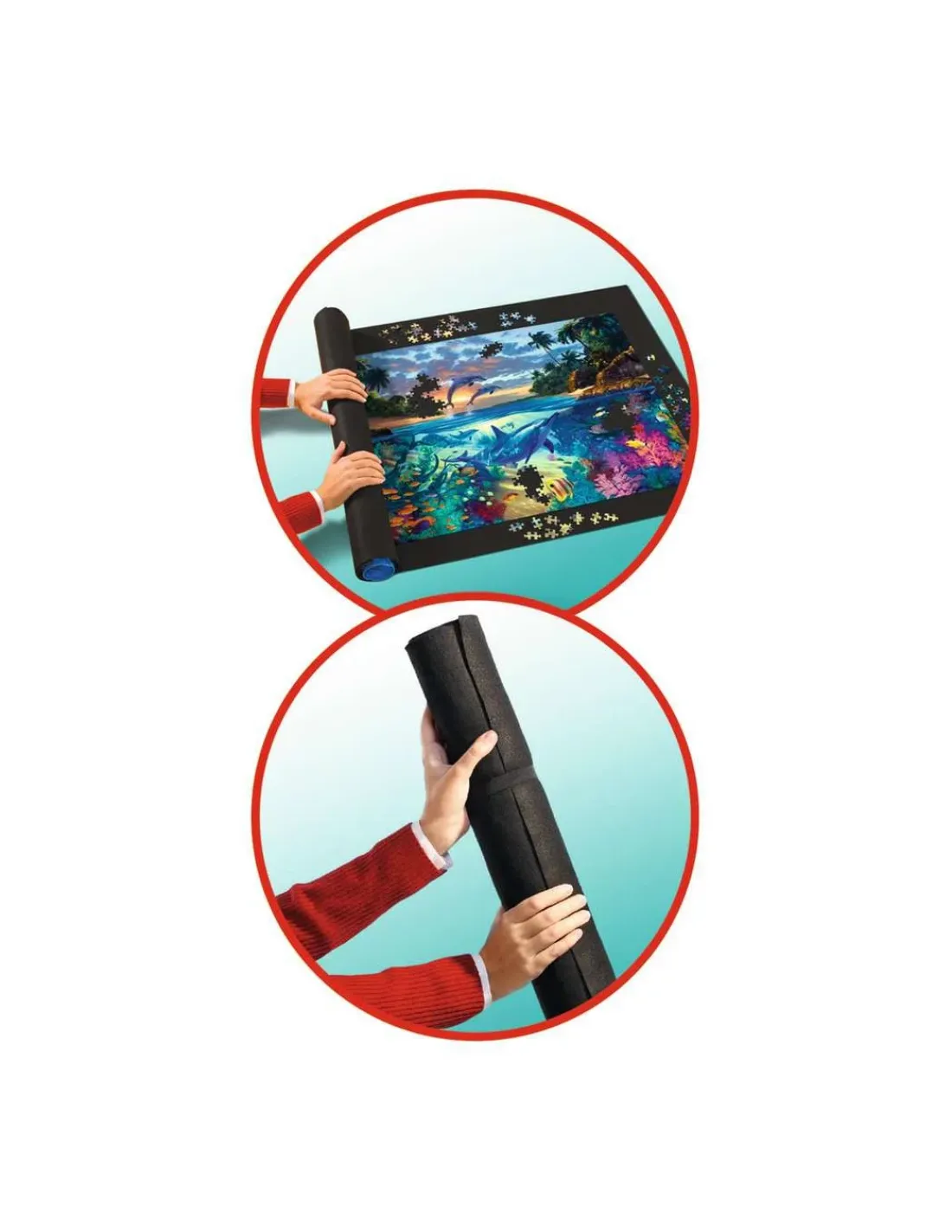 Réalisez votre puzzle directement sur le tapis antiglisse. Assemblez les 8 gouttières deux par deux (l’une avec un crochet et l’autre avec un billet) pour obtenir 4 sections de tube. Raccordez-les en un seul tube, en les tournant en sens opposés pour les bloquer. Placez le tube à l’extrémité de l’une des largeurs du tapis et enroulez soigneusement la feutrine avec le puzzle autour du tube. Fixez le rouleau avec les élastiques fournis. La feutrine antiglisse maintient toutes les pièces en place. Vous pouvez maintenant transporter ou ranger votre puzzle pour gagner de la place (de préférence couché), sans le moindre risque.