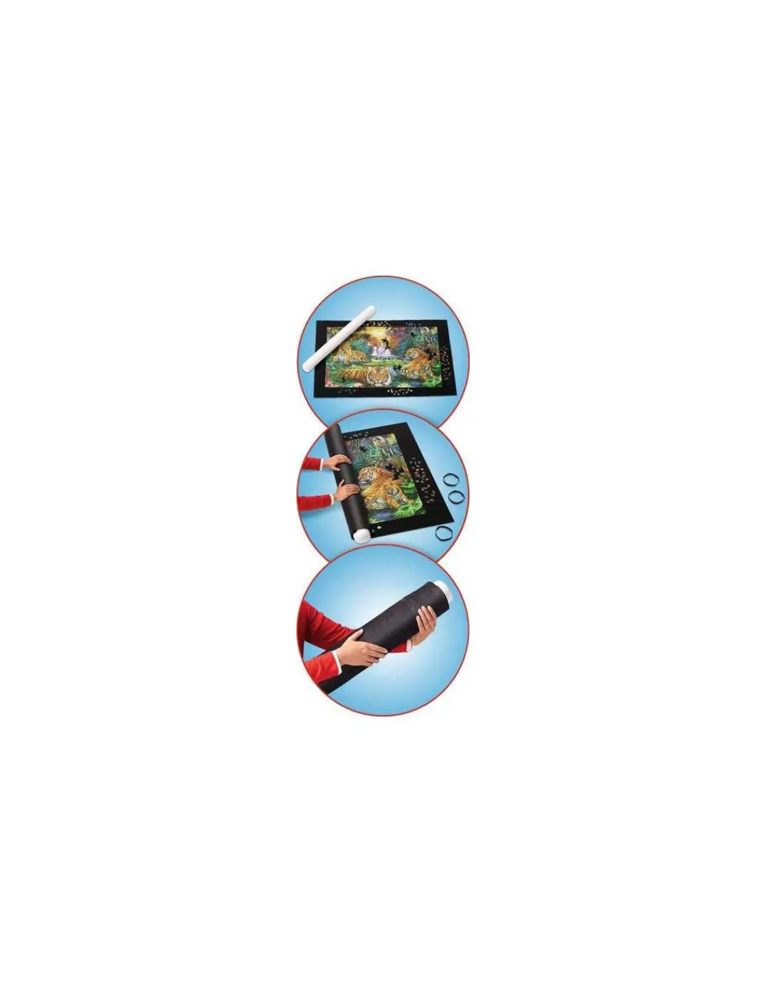Dépliez le tapis de feutrine pour y réaliser votre puzzle. Lorsque vous voulez le ranger, gonflez le rouleau et enroulez le tapis autour. Les 3 attaches élastiques permettent de tenir le rouleau bien fermé. Pas de perte de pièces, pas de perte de place !