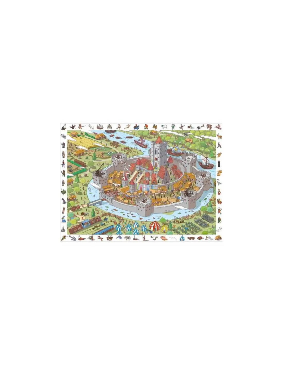 En assemblant les pièces, votre enfant découvrira, au fur et à mesure de l’activité, une scène représentant un château fort. Une fois le puzzle achevé, un jeu d’observation se présente à votre enfant. Arrivera t-il à retrouver tous les éléments présents sur la frise blanche à l’intérieur de l’illustration ?