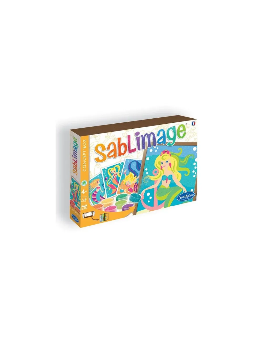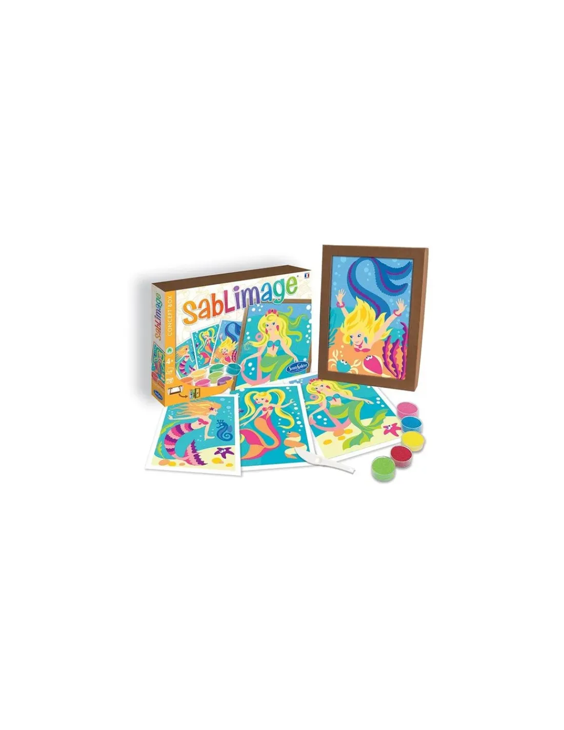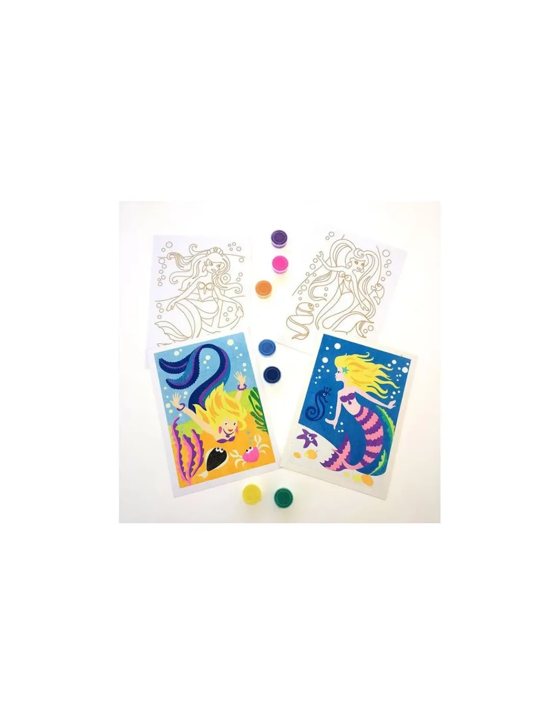 Découvrez le coffret Sablimage sirènes de Sentosphère, un coffret de sables colorés pour les enfants à partir de 4 ans, 4 tableaux à réaliser à offrir ou à encadrer sur le thème des sirènes.