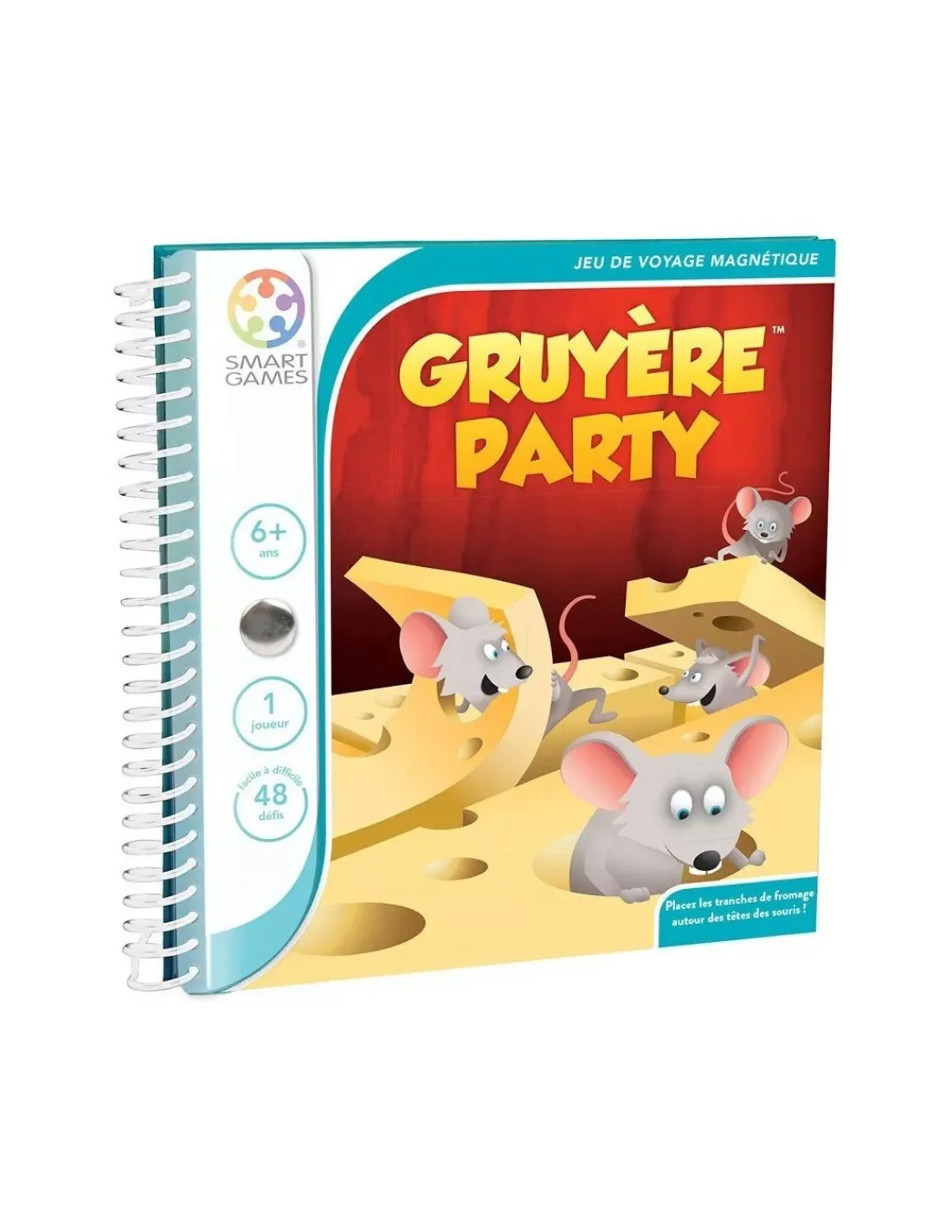 Découvrez le jeu gruyère party de SmartGames, un jeu magnétique de logique et de réflexion pour les enfants dès 6 ans avec 48 défis à réaliser dans un format poche où vous devrez mettre les souris dans les trous.