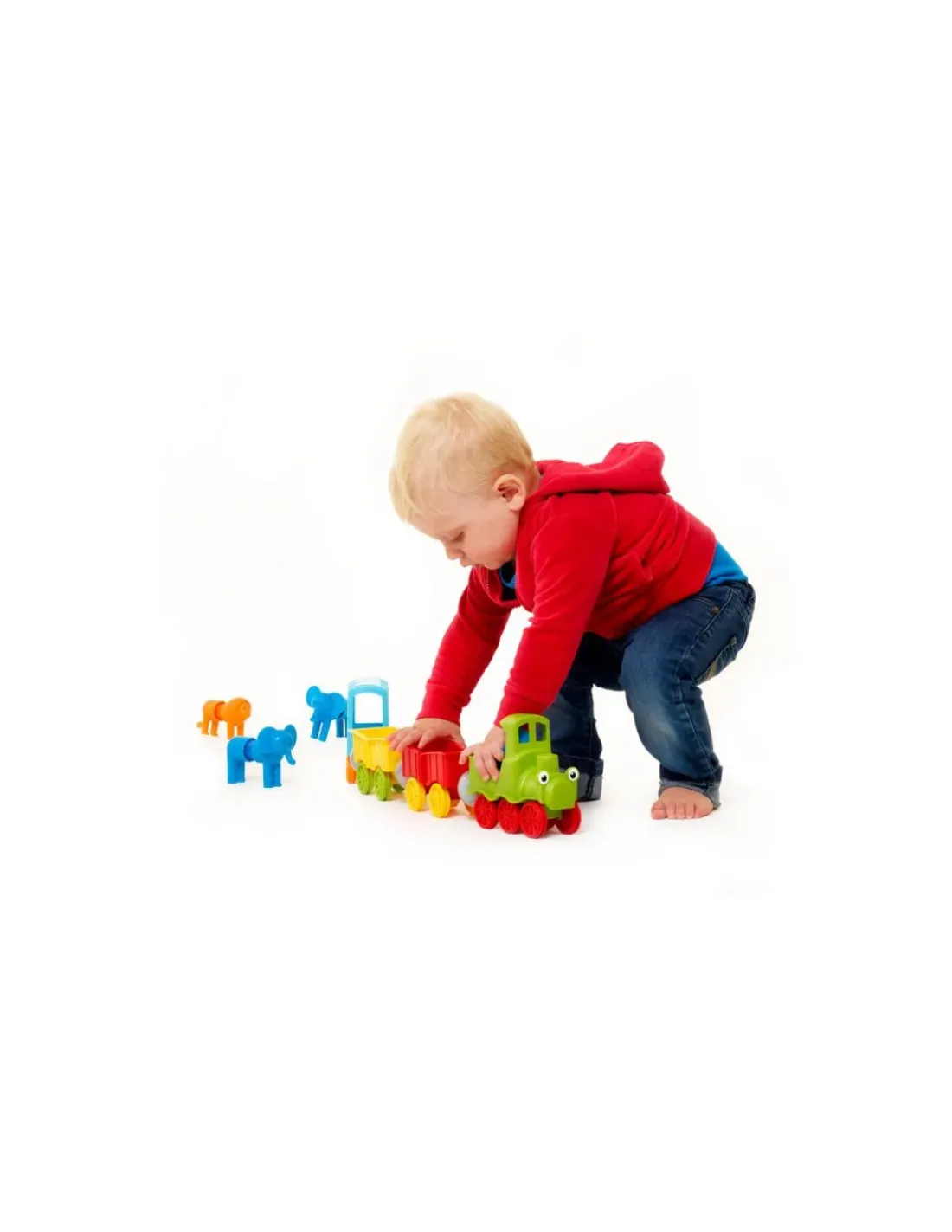 Ce coffret contient 25 pièces : une locomotive en 2 parties, 3 wagons en 2 parties, 4 bâtonnets longs et 3 boules, un conducteur, 2 animaux en 2 parties et 3 bâtonnets courts.