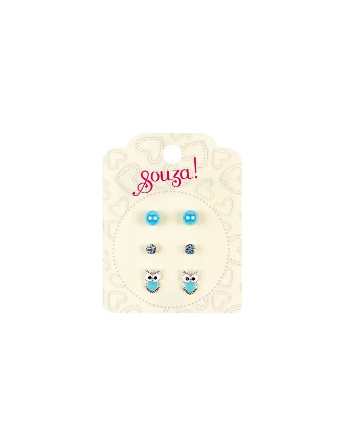 Un cadeau comprenant 3 paires boucles d’oreilles avec une paire de perles bleues, une paire avec des strass et une paire avec une chouette.