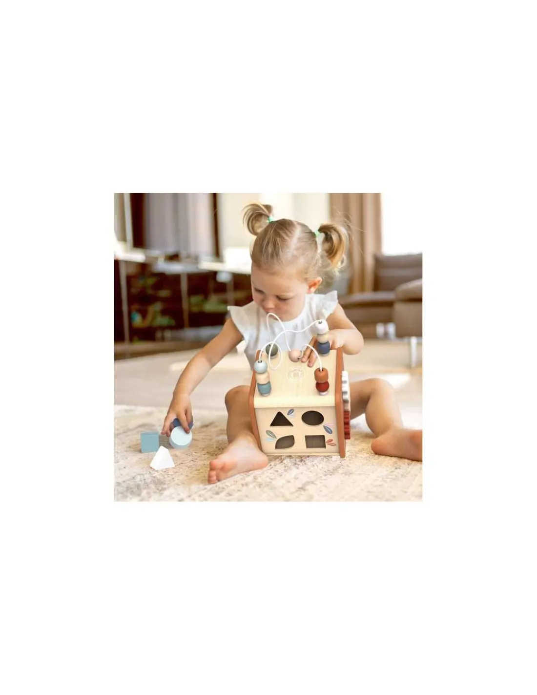 Ce cube d’activités propose quatre faces d’activités éducatives et ludiques pour aider les jeunes enfants à apprendre tout en jouant. Le dessus est un labyrinthe de perles, et les autres activités incluent un trieur de formes, des engrenages, un puzzle et bien plus encore.
