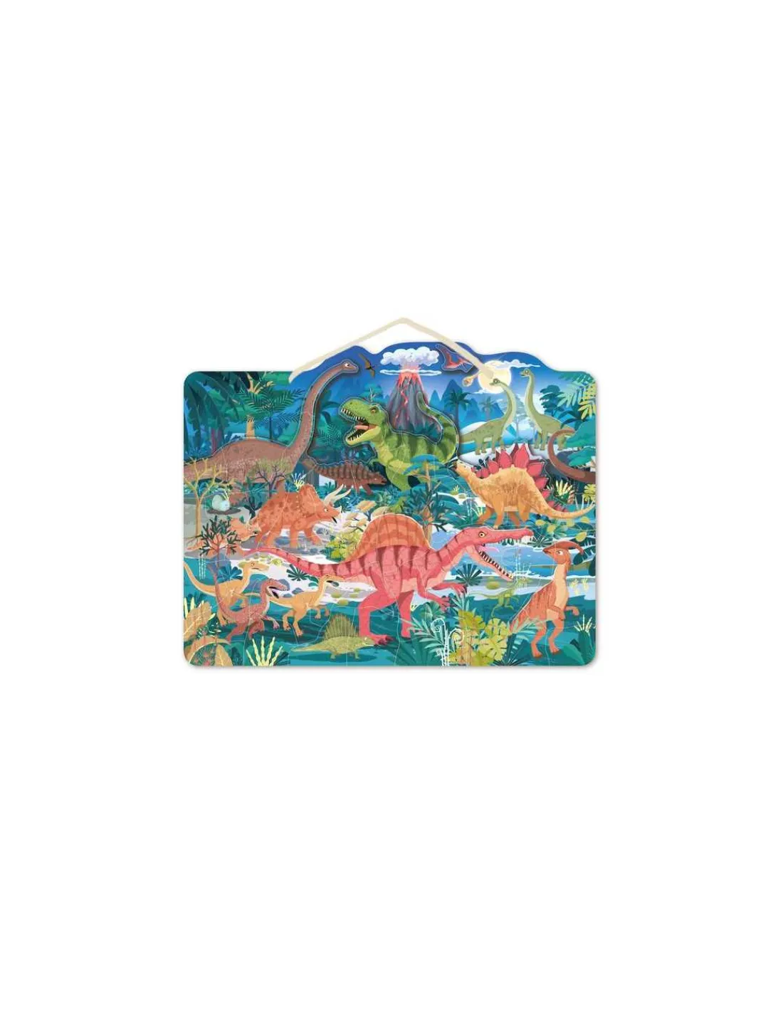 Un puzzle illustré sur le thème des dinosaures qui décore la chambre des enfants. Les pièces magnétiques doivent être placées une à une dans le dessin, développant la concentration et la logique.