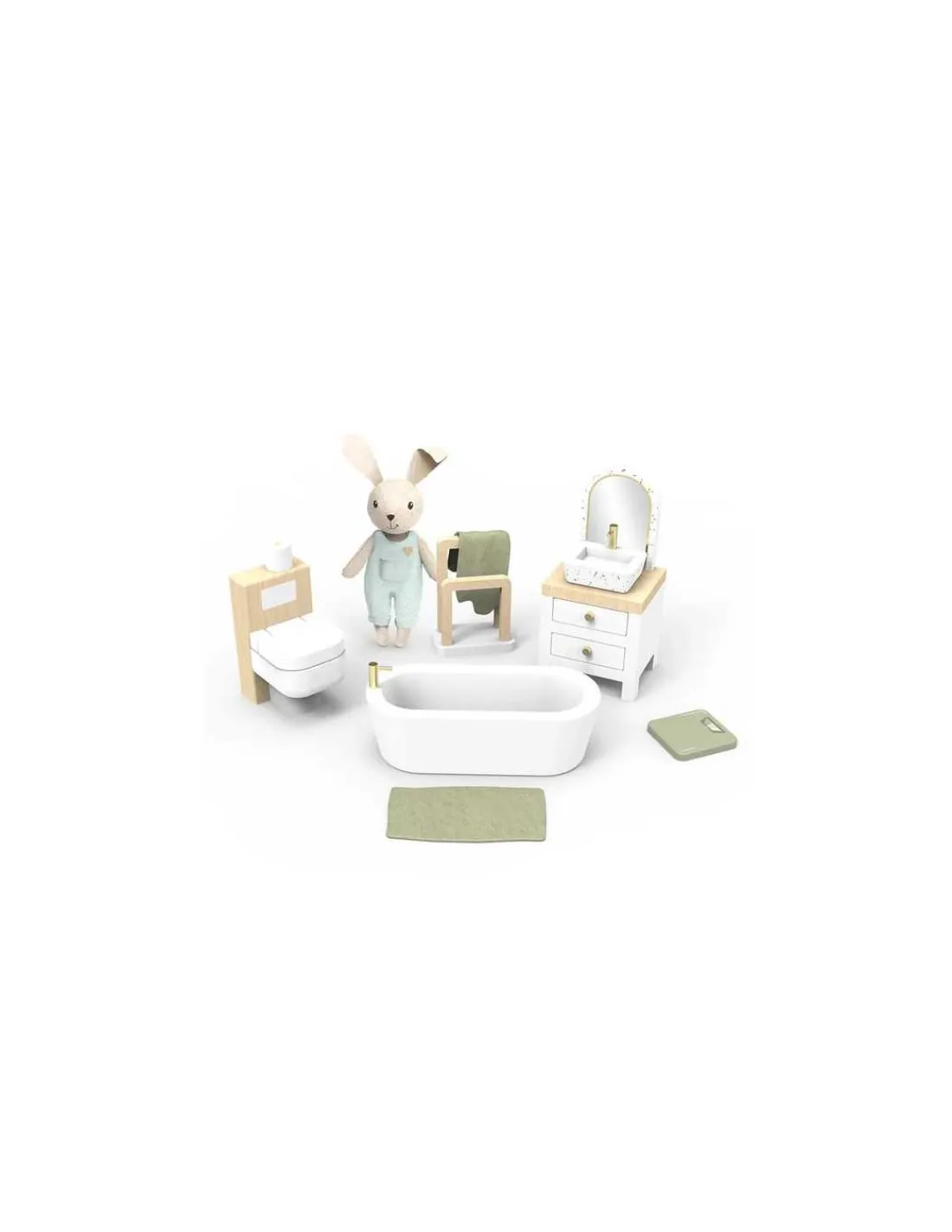 Découvrez la Salle de bain pour maison de poupée de Speedy Monkey, un coffret cadeau comprenant une salle de bain en bois et un personnage lapin en lin qui fera rêver les enfants à partir de 3 ans.