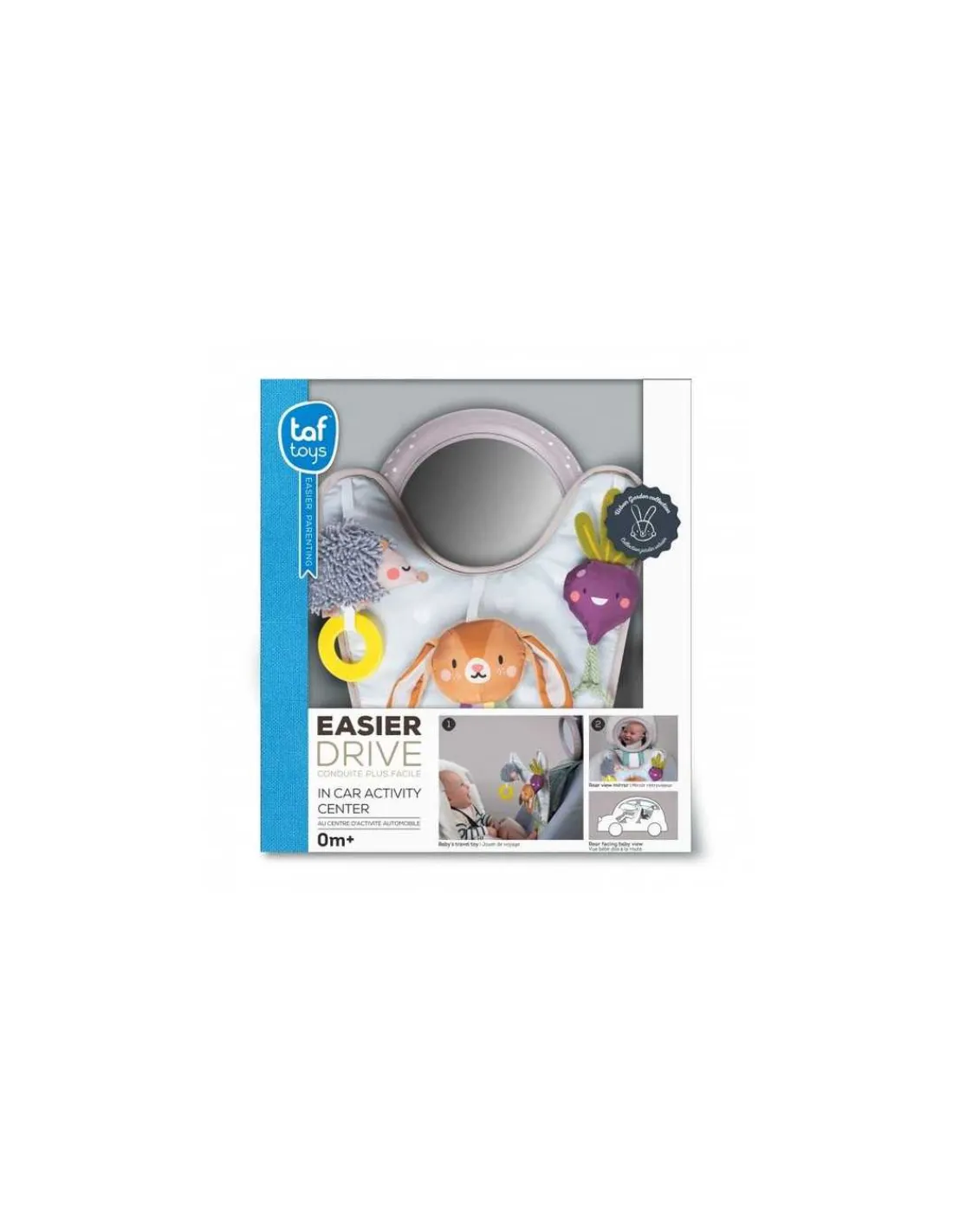 Le kit se compose d’un tableau d’activité et d’un miroir incurvé. Le miroir permet aux parents assis à l’avant de la voiture d’avoir un œil sur bébé. Ce jouet d’éveil comprend des activités variées: betterave bruissante, hérisson texturé avec anneau de dentition et lapin carillon.