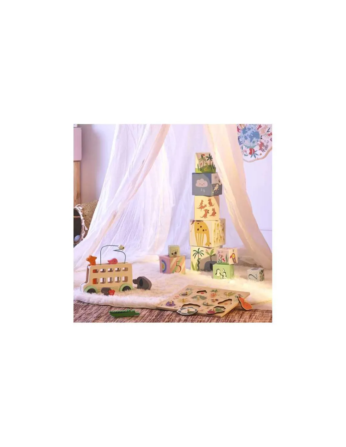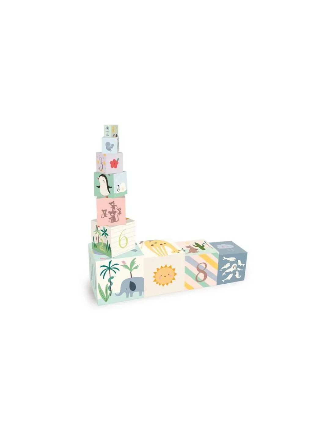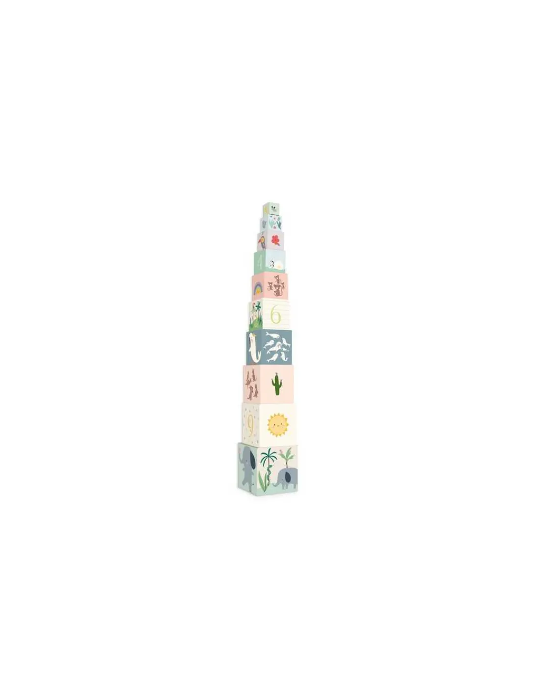 10 cubes pour une tour de 95 cm avec 5 faces à découvrir, un jouet d’éveil incontournable à offrir en cadeau.