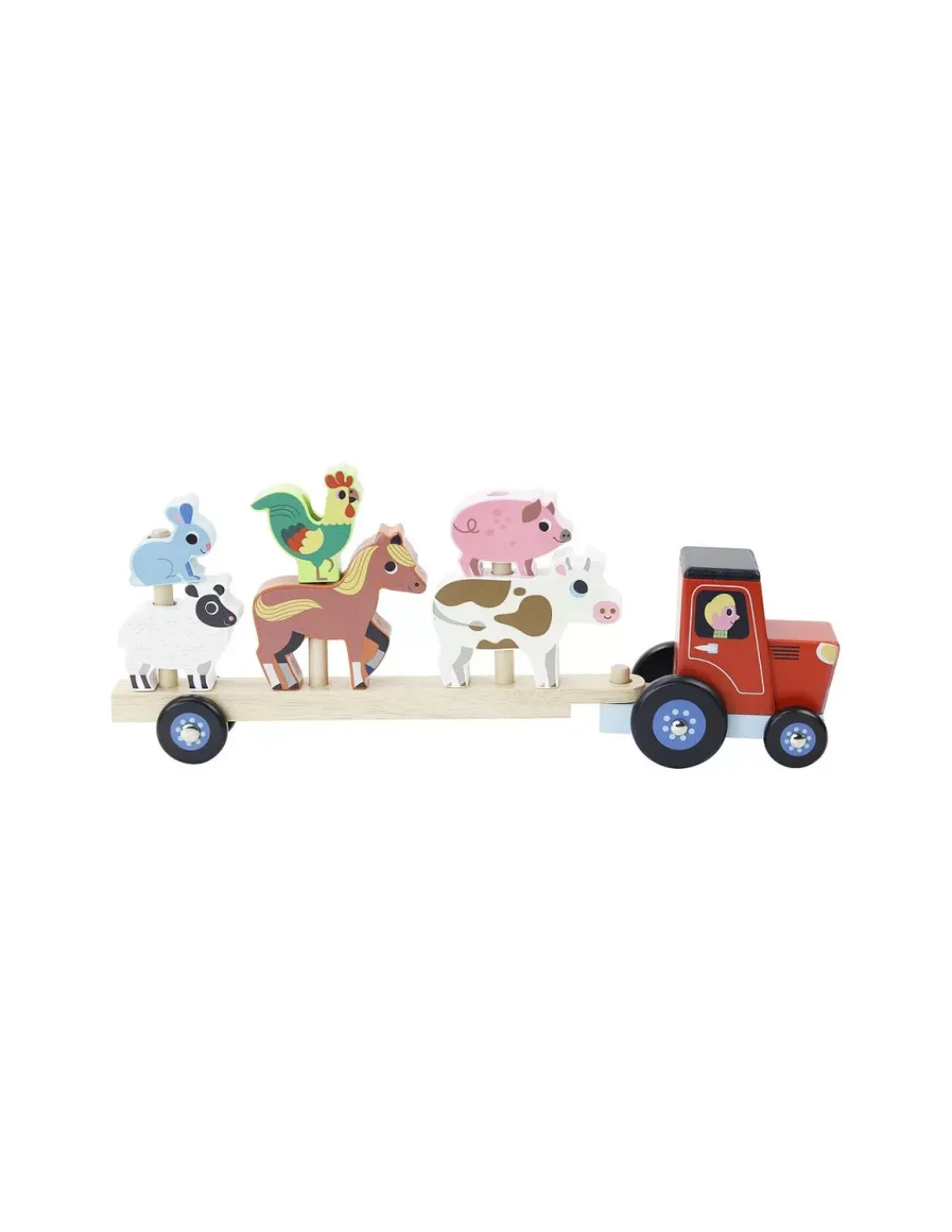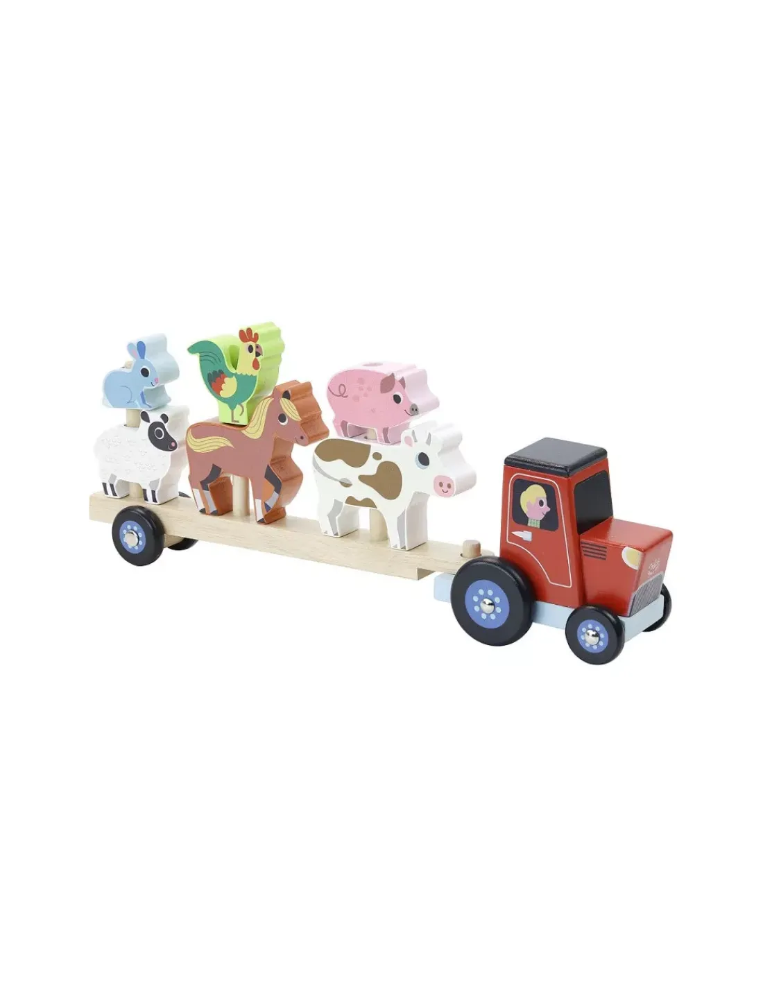 Après avoir joué avec ses animaux, c’est tellement rigolo de les ranger les uns sur les autres sur la remorque du tracteur. Mouton, vache, cheval, cochon, lapin et coq trouveront place dans la remorque du tracteur.