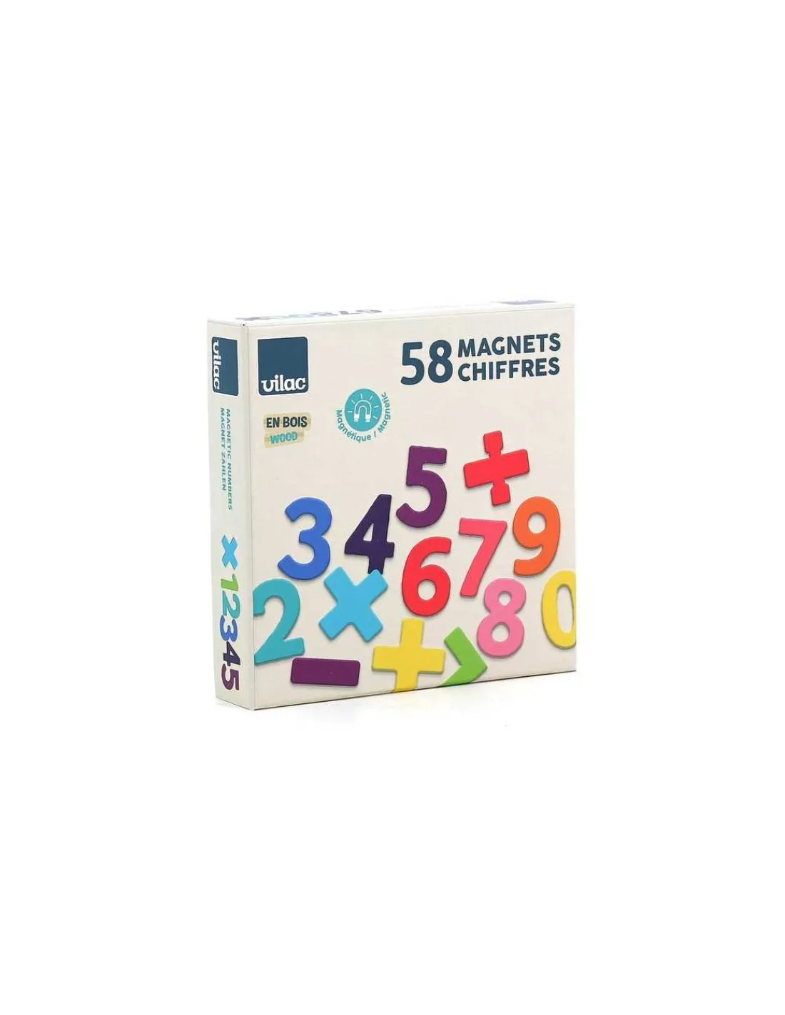 Découvrez les Magnets chiffres bois 58 pièces de Vilac, un coffret éducatif avec des chiffres en bois magnétiques pour les enfants à partir de 3 ans.