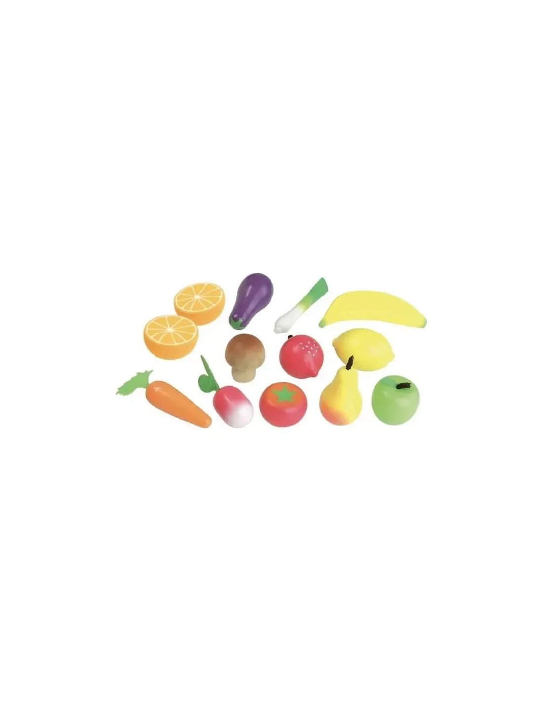 Cette barquette en carton contient 12 fruits et légumes en bois pour manger 5 fruits et légumes par jour : pomme, poire, orange, poireau, champignon, radis, tomate, banane, carotte, citron…