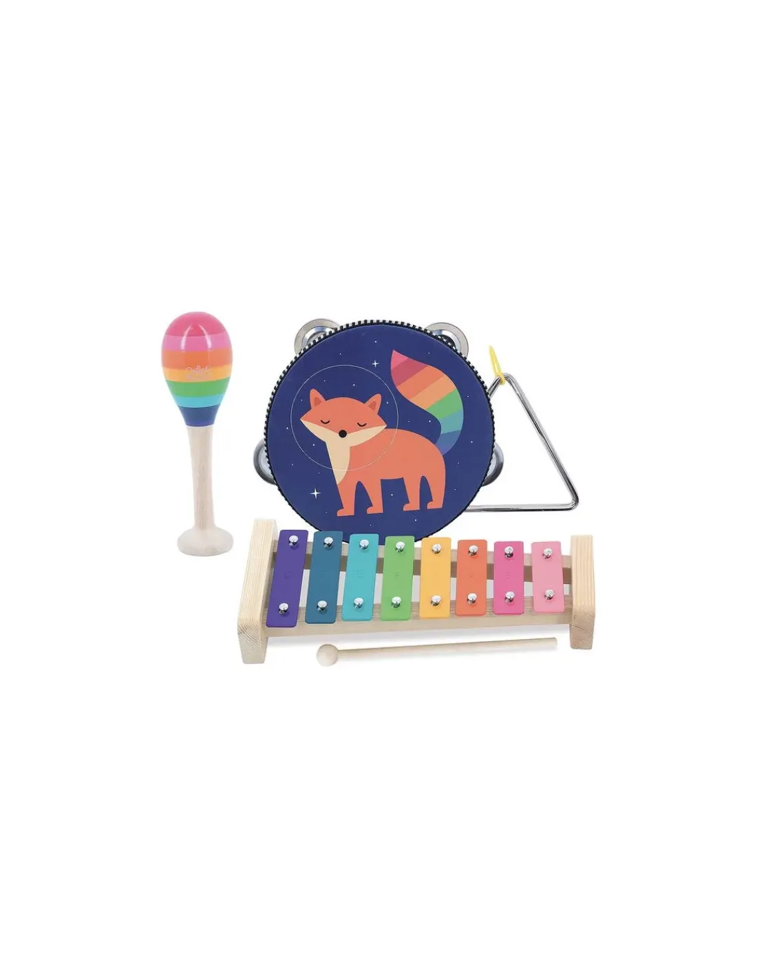 Découvrez le set de musique arc-en-ciel de Vilac illustré par Andy Westface, un set de 4 instruments de percussions illustrés avec poésie dans les tons arc-en-ciel. Il est composé d’un métallophone, d’un triangle, d’une maracas et d’un tambourin pour les enfants à partir de 3 ans.