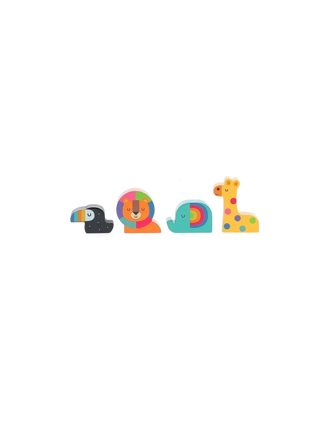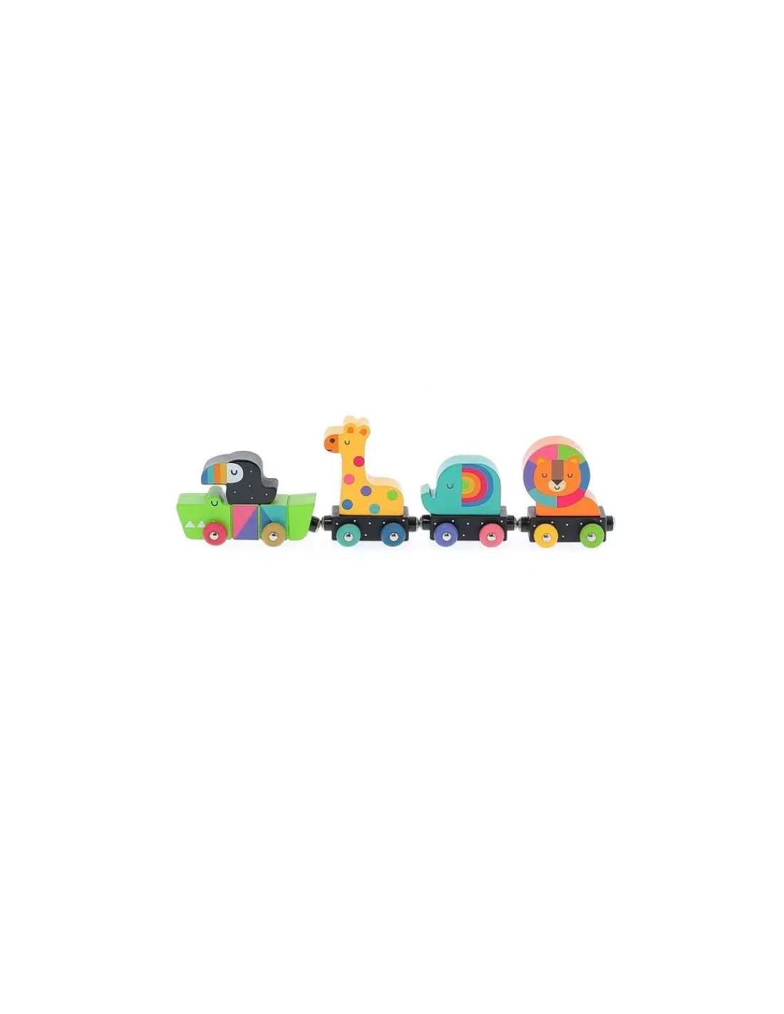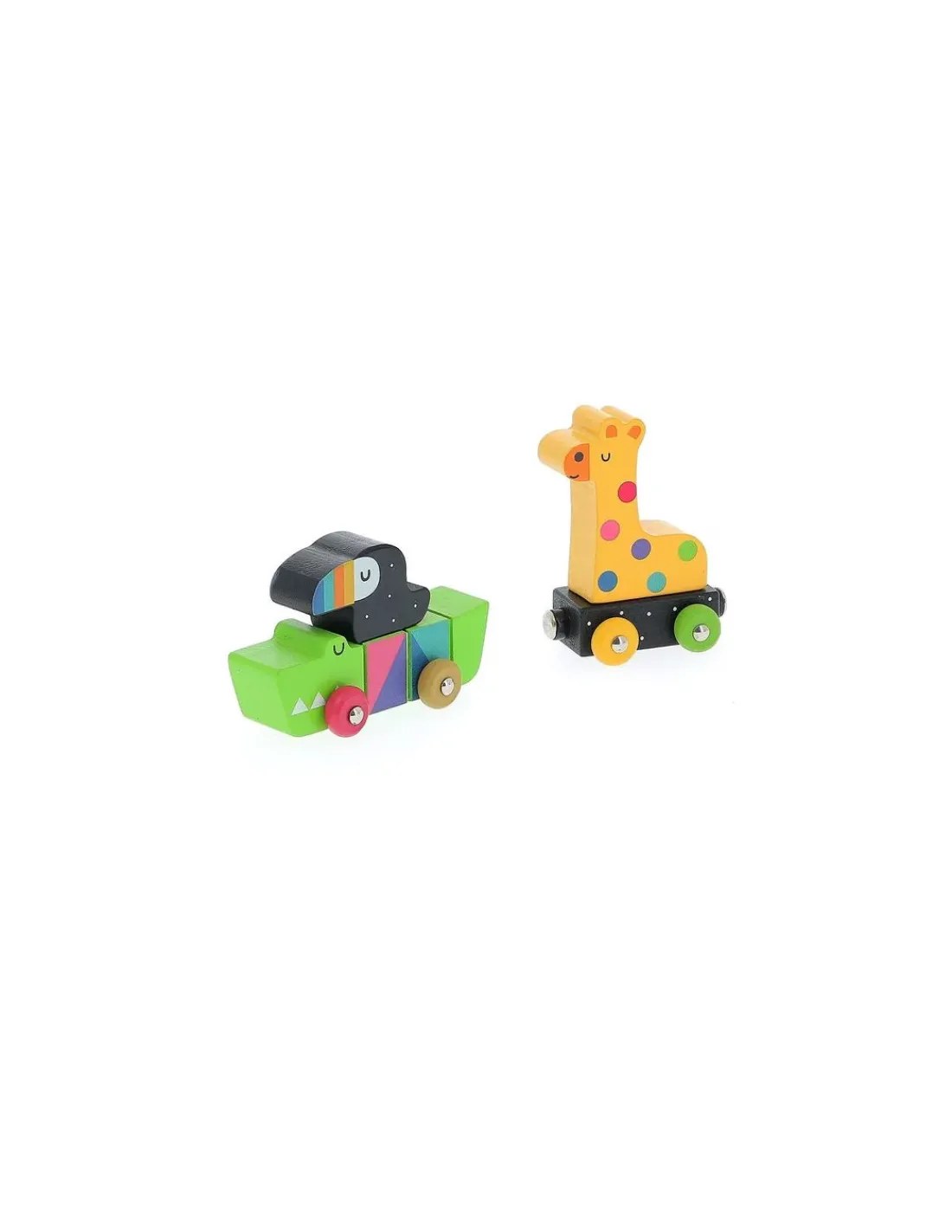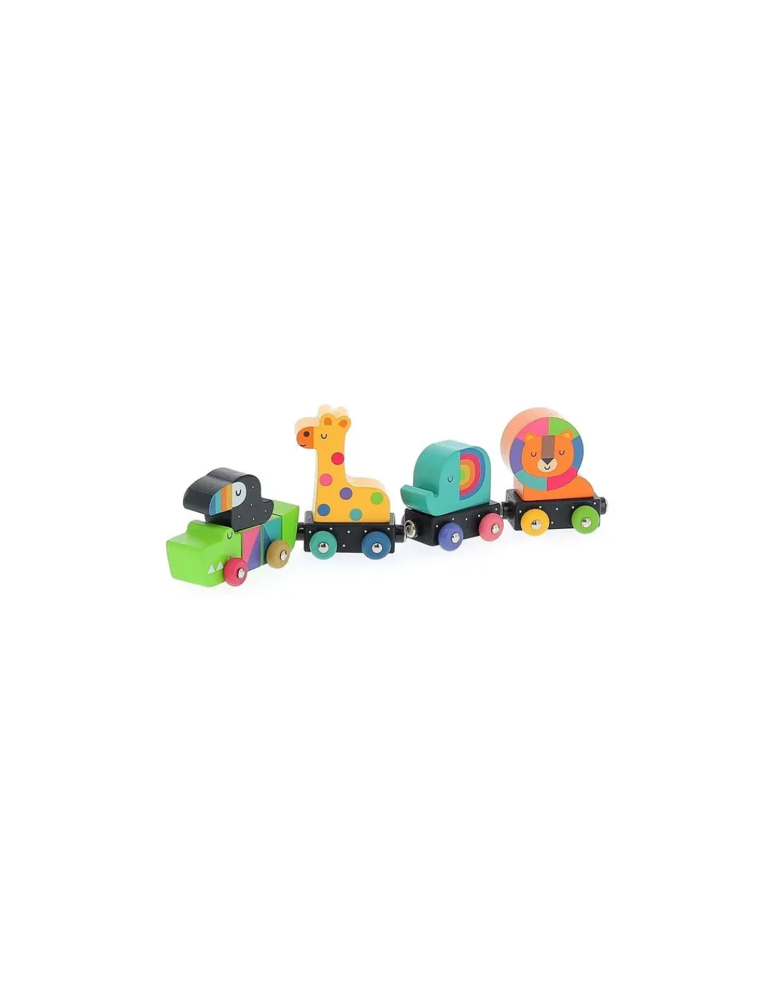 Une loco-croco surmontée d’un toucan, suivie de ses compagnons le lion, la girafe et l’éléphant arc-en-ciel. Ce joli petit train en bois permettra aux enfants de jouer avec ces animaux amovibles et de les remettre sur leurs wagons aimantés pour les promener.