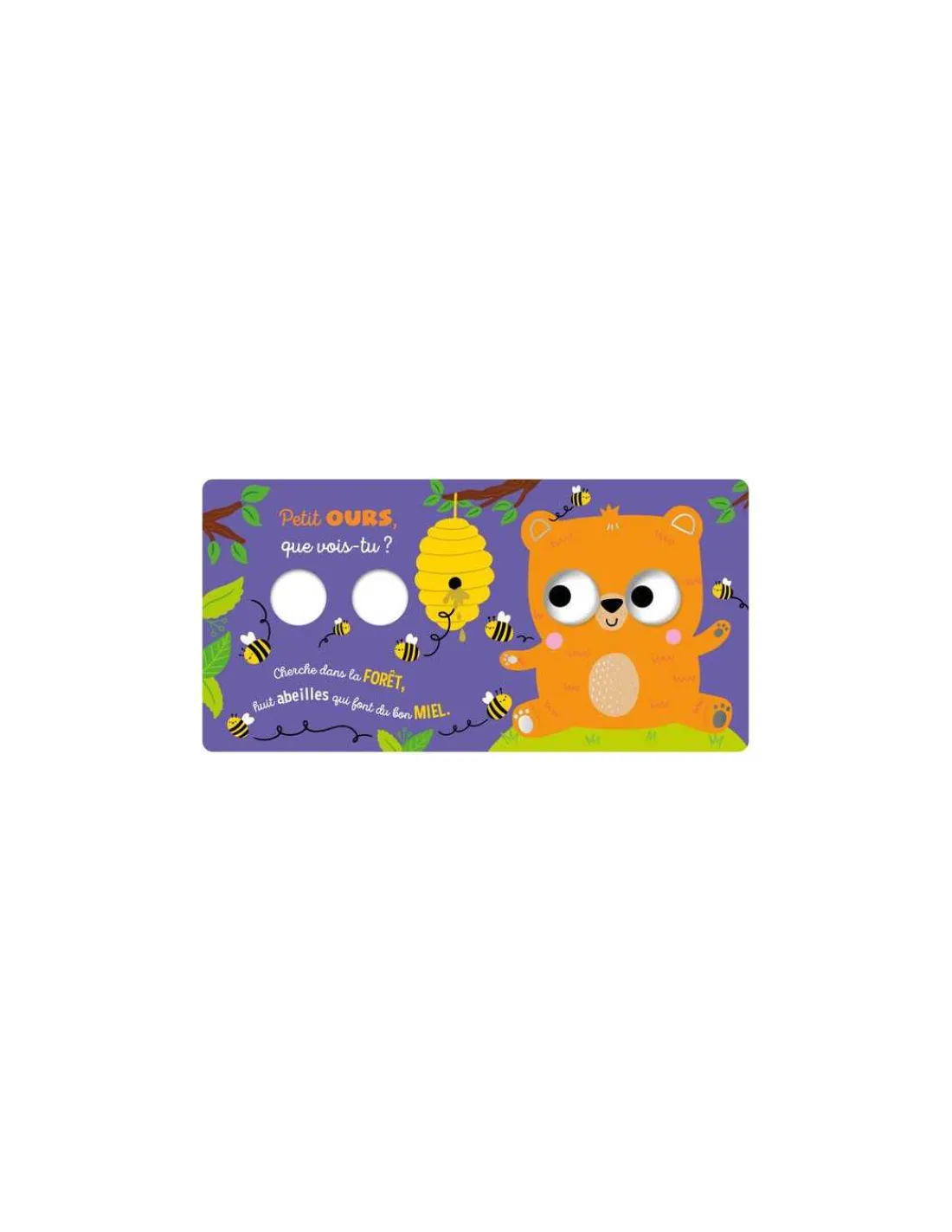 Cinq animaux très mignons, des gros yeux qui bougent sur toutes les pages, des surfaces à toucher, du papier doré et des choses à chercher : les touts petits vont être captivés par ce livre très coloré !