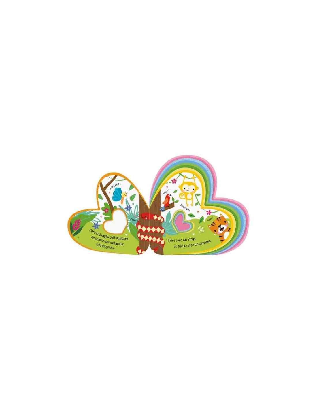 Les pages de taille croissante stimulent le sens de l’observation et la coordination œil/main. En compagnie d’un joli papillon, les tout-petits vont découvrir les animaux de la ferme, de la jungle, de l’océan, de la savane et du jardin.