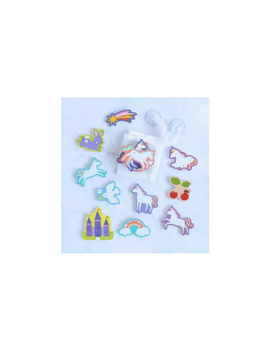 Vivez un plaisir de bain sans fin avec ce joli jouet de bain en mousse avec des licornes. Les 14 pièces adhèrent au mur de la douche ou au carrelage lorsqu’elles sont mouillées et peuvent être soigneusement rangées dans le filet fourni après utilisation.