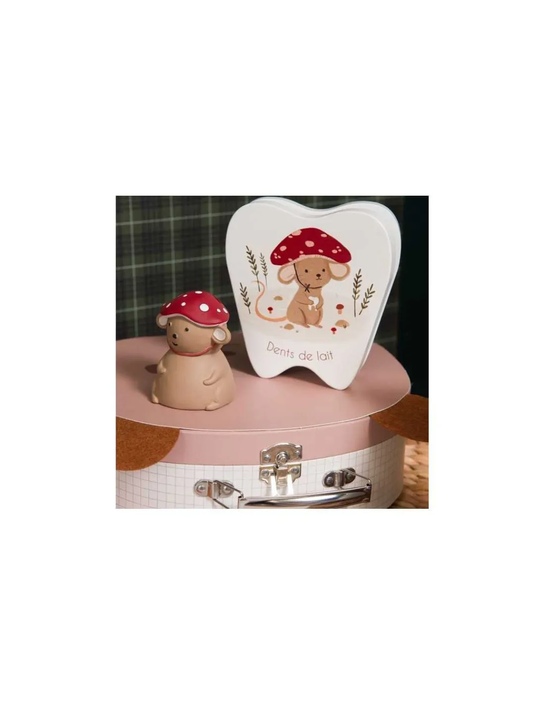 Une jolie boite en forme de dent qui s’ouvre dans laquelle vous pourrez placer les 20 dents de lait de votre enfant et y glisser une pièce à l’intérieur lorsque la souris sera passée.