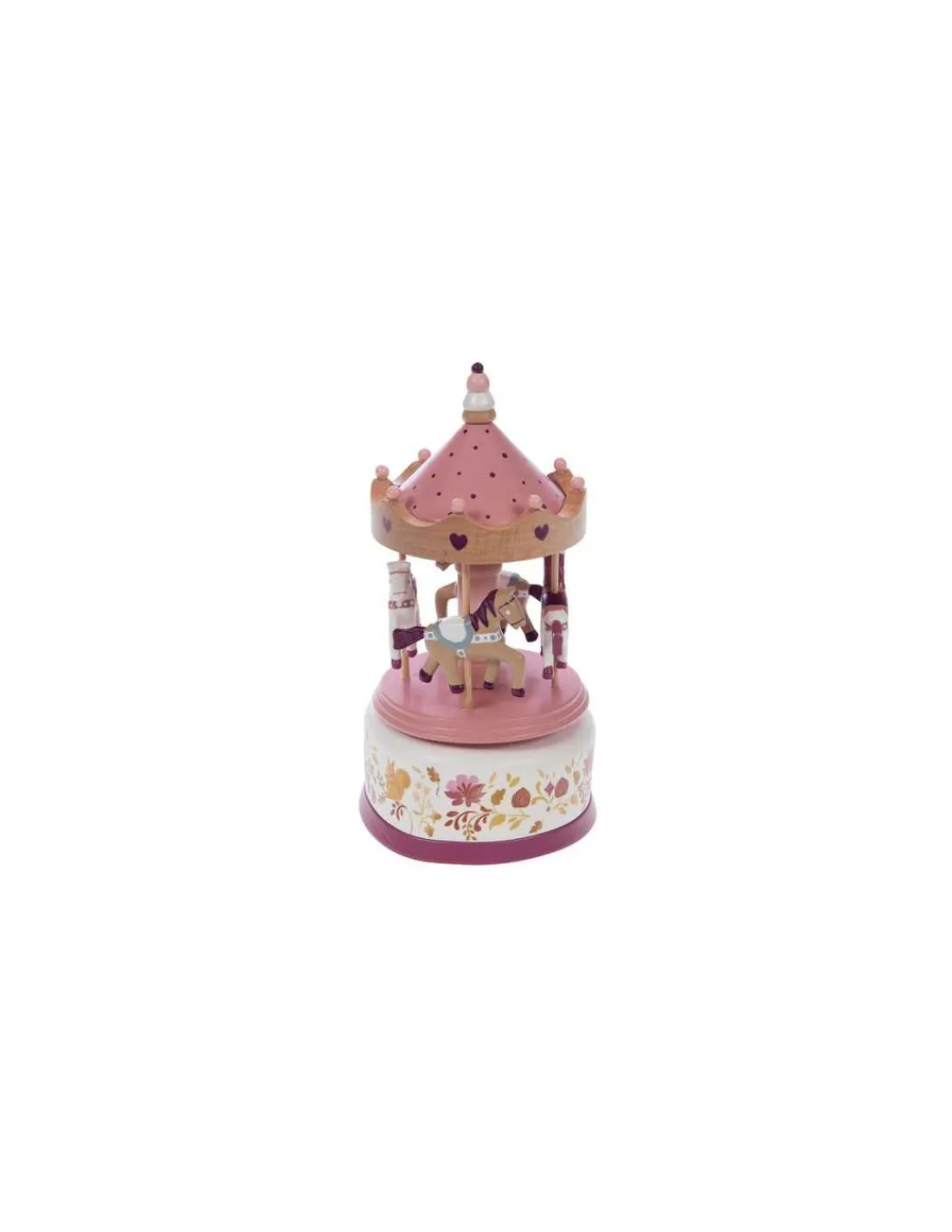 Ce cadeau trouvera sa place dans toutes les chambres d’enfants. Un manège musical où le mécanisme de la boite à musique se remonte en maintenant la partie inférieure du carrousel tout en tournant le chapiteau dans le sens des aiguilles d’une montre.