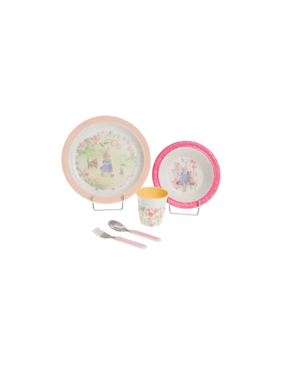 Découvrez le coffret repas Ombeline de Amadeus Les Petits, un coffret vaisselle qui se compose de 5 pièces avec une assiette, un bol, un verre, une cuillère et une fourchette illustrés avec Ombeline la lapine, son fidèle chat et un décor floral enchanteur.