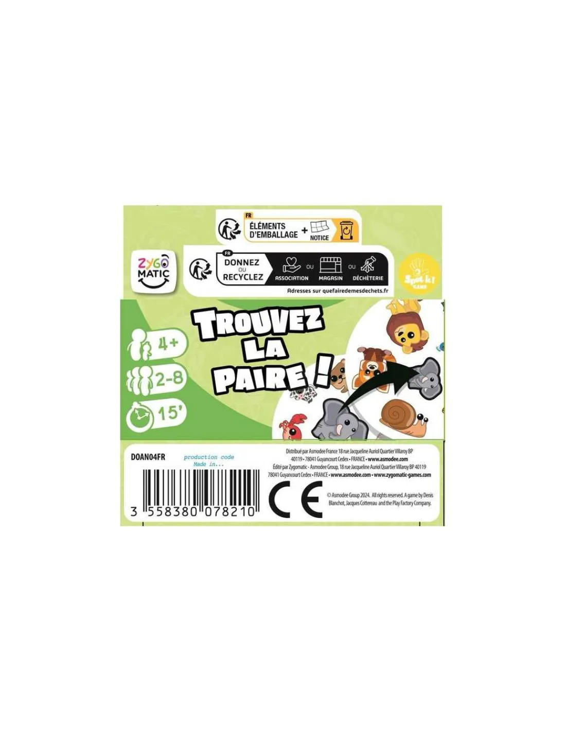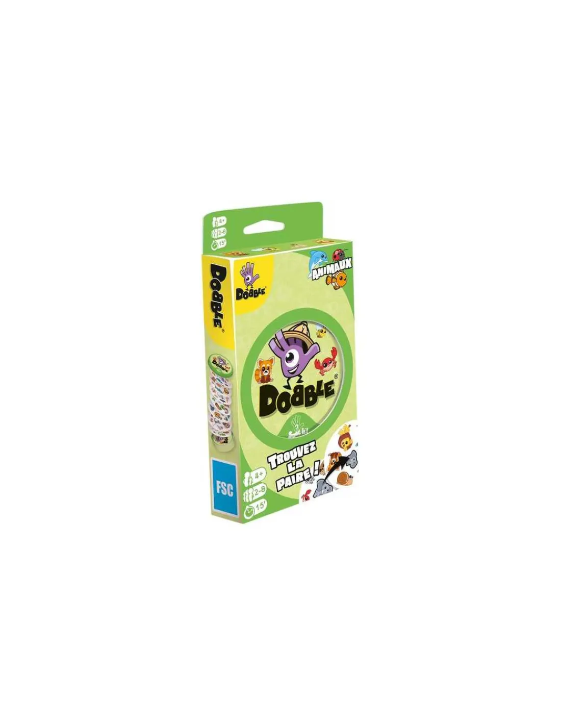 Découvrez le jeu Dobble animaux, un jeu d’ambiance, d’observation et de rapidité dans lequel tous les joueurs jouent en même temps. Un jeu au thème animalier pour jouer de 2 à 8 joueurs à partir de 4 ans. Dobble, c’est 55 cartes, 6 animaux par carte et toujours un et unique animal identique entre chaque carte. Repérez plus vite que vos adversaires l’animal en commun entre deux cartes.