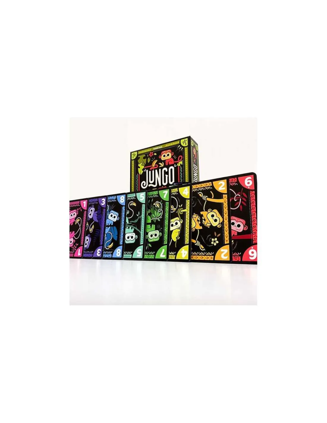 Jungo est un jeu de construction de main où le but est d’être le premier à se débarrasser de toutes ses cartes. A chaque tour, vous devez battre la combinaison sur la table en jouant des cartes adjacentes de même valeur de votre main… sans jamais les trier !