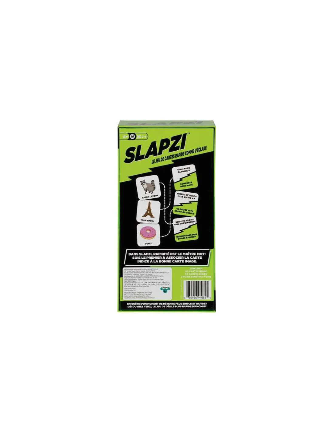 Découvrez le jeu Slapzi, le jeu d’ambiance et de rapidité pour jouer de 2 à 8 joueurs à partir de 8 ans. Un jeu de cartes rapide comme l’éclair ! Soyez le premier à associer la carte indice à la bonne carte image.