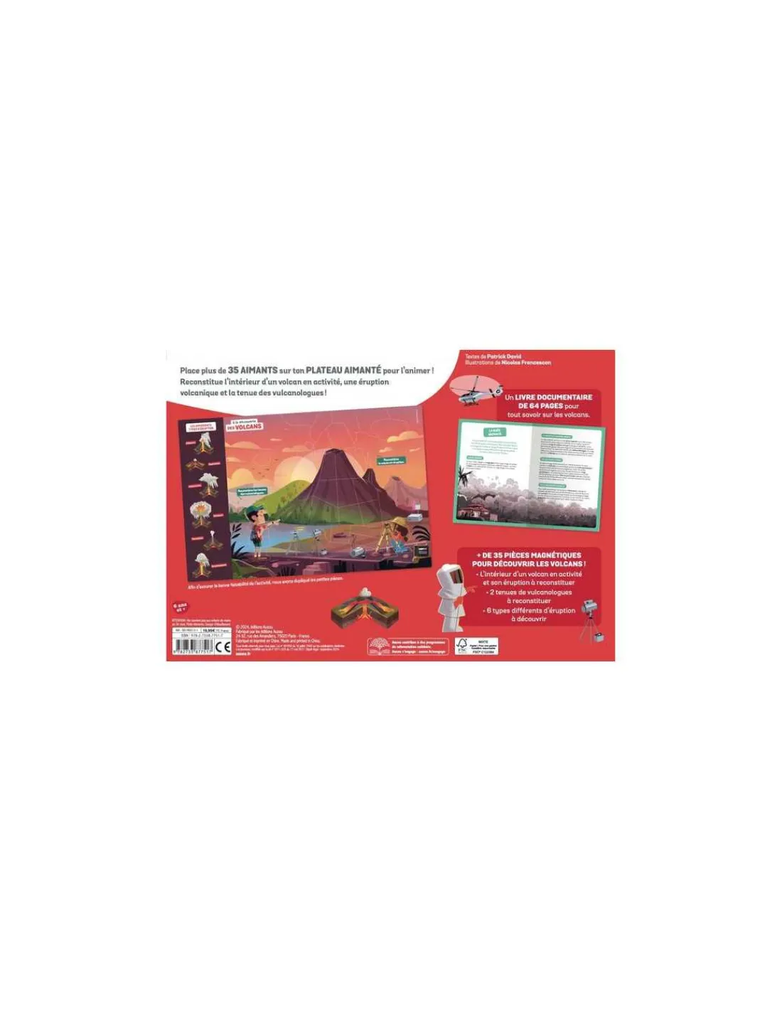 Ce coffret complet comprend un livre documentaire de 64 pages richement illustré et documenté, pour tout savoir sur les volcans : leur formation, les différents types d’éruptions, les zones volcaniques célèbres, et bien plus encore. Vous trouverez également un grand plateau aimanté accompagné de 35 aimants permettant de reconstituer l’intérieur d’un volcan en activité, une éruption volcanique, les tenues des vulcanologues…