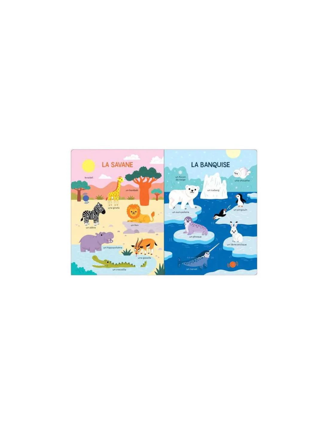 Ce bel imagier sonore grâce auquel l’enfant découvre ses premiers mots tout en douceur avec des illustrations simples et familières. Un livre qui fait découvrir les objets du quotidien à travers plusieurs lieux : la cuisine, la chambre, la salle de bain, le salon, la crèche, l’école, la ville, la ferme, la banquise, la savane, la forêt, l’océan… Les sons facilitent l’appropriation du nouveau vocabulaire et sa mémorisation.