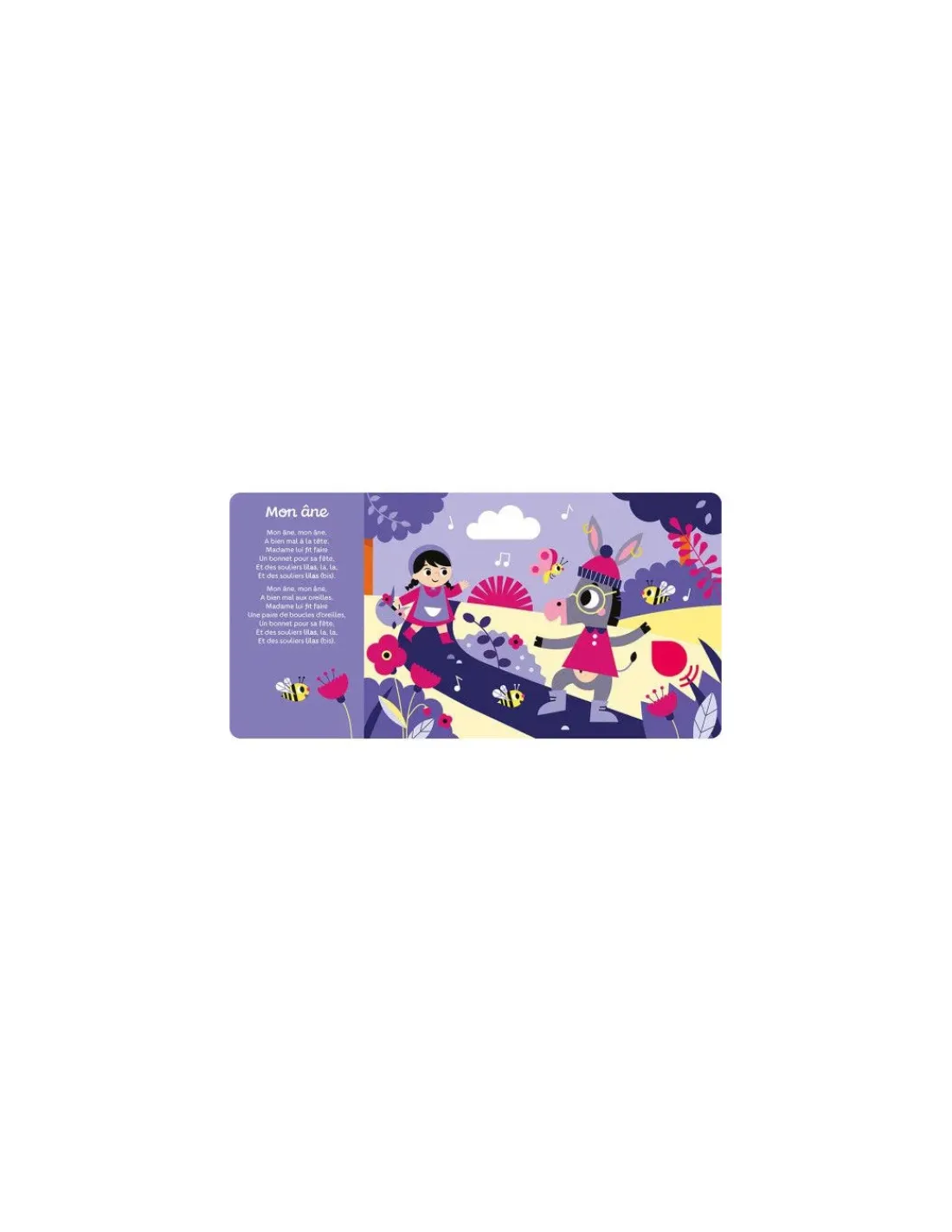 Un livre musical à mettre entre les mains des enfants en toute autonomie ou à partager joyeusement. En appuyant sur les puces sonores, votre enfant pourra écouter « Mon âne », « La chanson des couleurs », « Coccinelle demoiselle », « Vole joli papillon », « Éléphant blanc » et « Petite poule grise ».