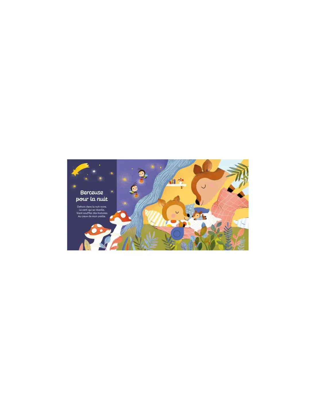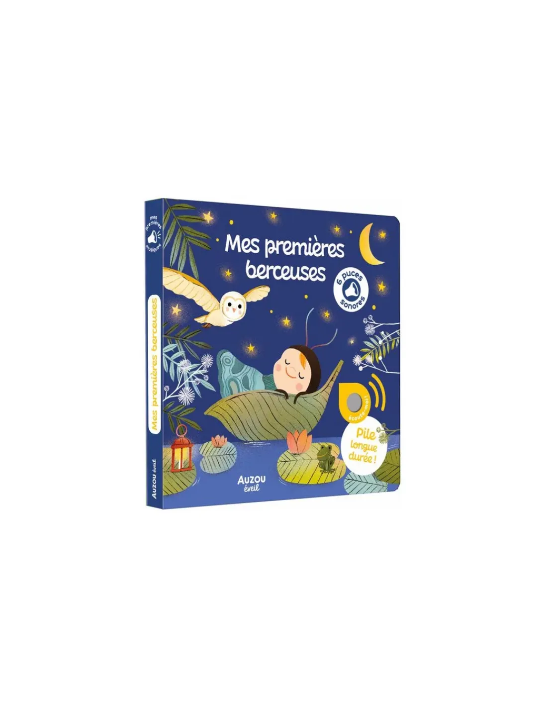 Un livre musical à mettre entre les mains des enfants en toute autonomie ou à partager joyeusement. En appuyant sur les puces sonores, votre enfant pourra écouter « Coucou hibou », « Fais dodo, Colas mon p’tit frère », « Meunier, tu dors », « Berceuse pour la nuit », « Au clair de la lune » et « Berceuse cosaque »