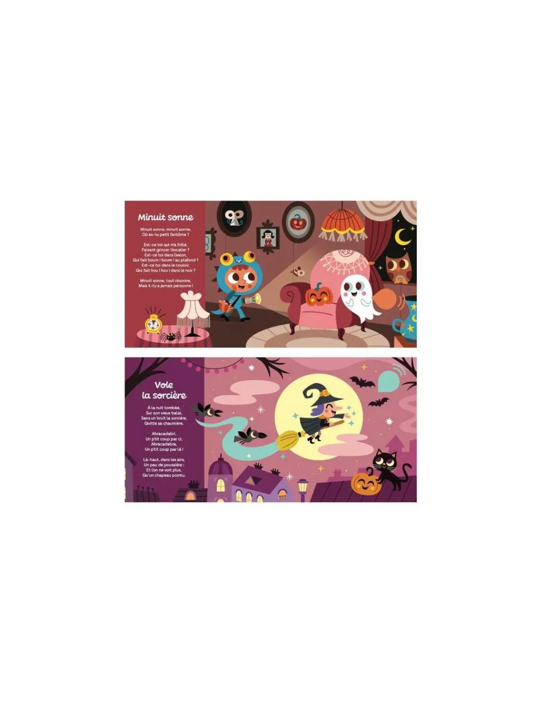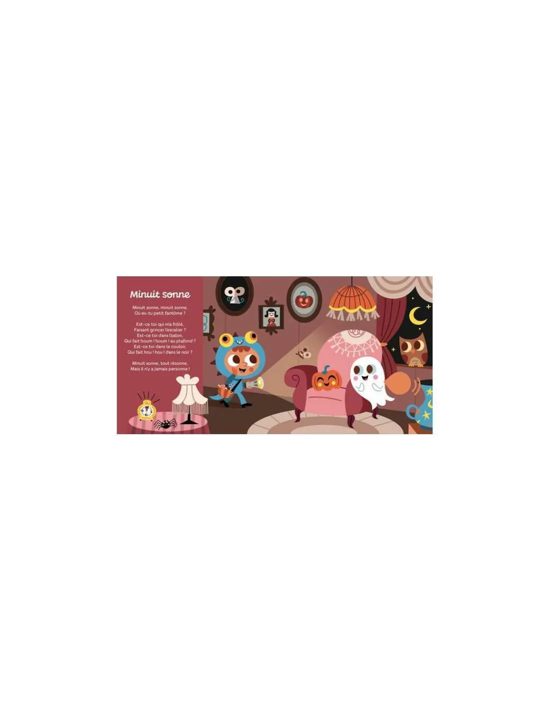 Un livre sonore pour plonger dans l’univers d’Halloween à travers des comptines connues et inventées : Minuit sonne, Peur d’une petite bête, Promenons-nous dans les bois, Vole la sorcière, L’araignée gypse, Le bonbon.