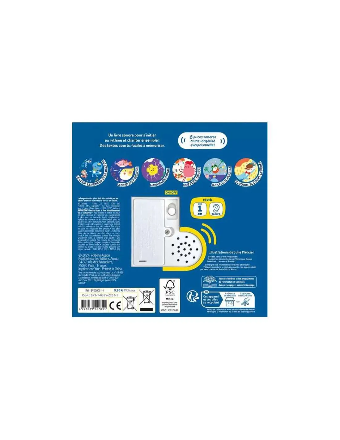 Un livre musical à mettre entre les mains des enfants en toute autonomie ou à partager joyeusement. Des textes courts et faciles à mémoriser avec 6 puces sonores d’une longévité exceptionnelle.