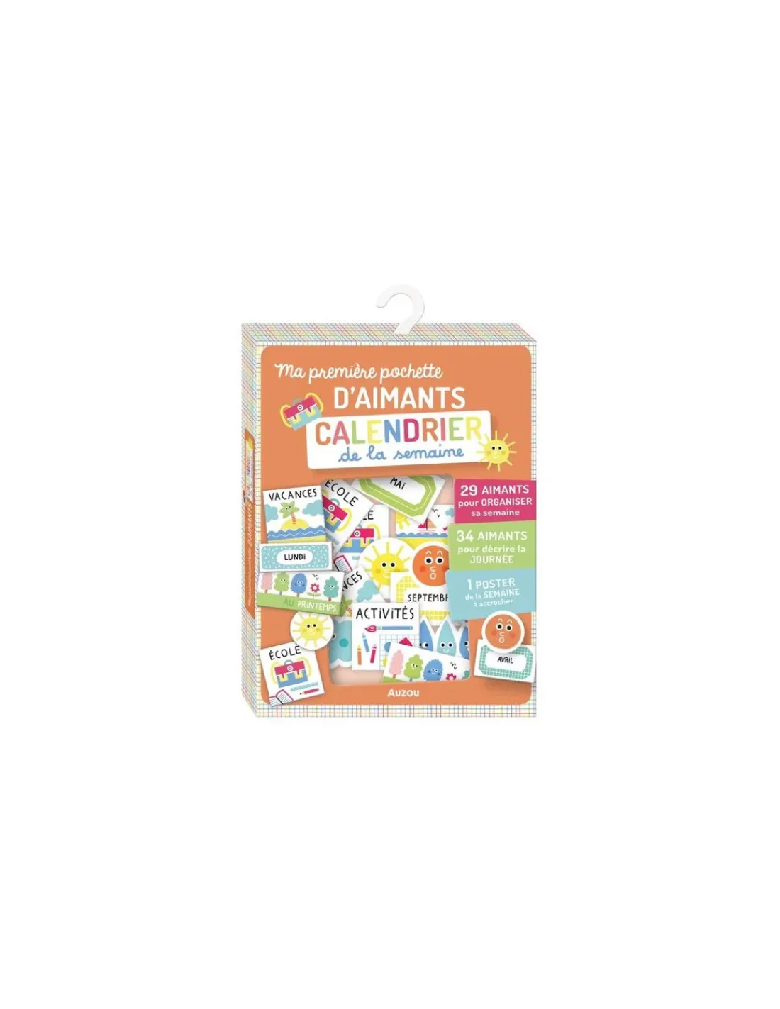 Une pochette avec plus de 50 aimants et un grand poster-calendrier pour organiser la semaine et apprendre les jours, les mois, le temps qu’il fait, les émotions…