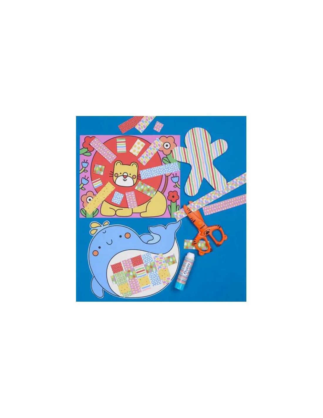 Ce coffret contient 15 activités faciles à réaliser pour les enfants à partir de 3 ans qui tournent autour du découpage : 90 bandes à découper et à coller, des animaux à tisser … Une paire de ciseaux fantaisie et un tube de colle sont fournis.