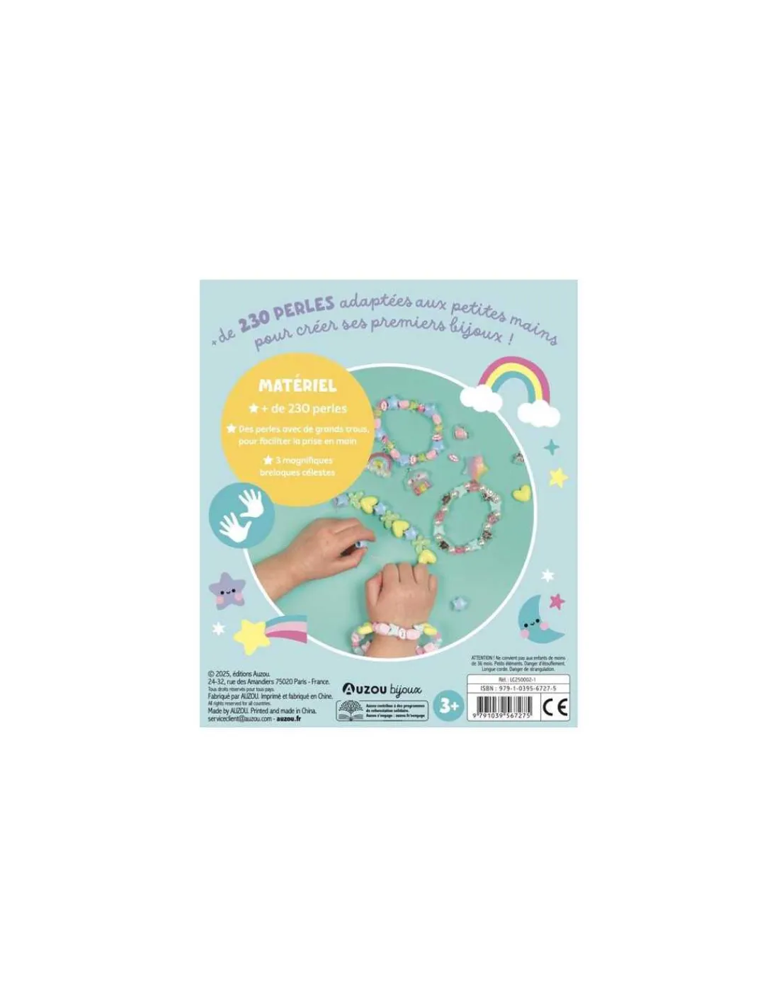 Le coffret contient plus de 230 perles en plastique, 3 breloques fantaisie et du fil élastique.