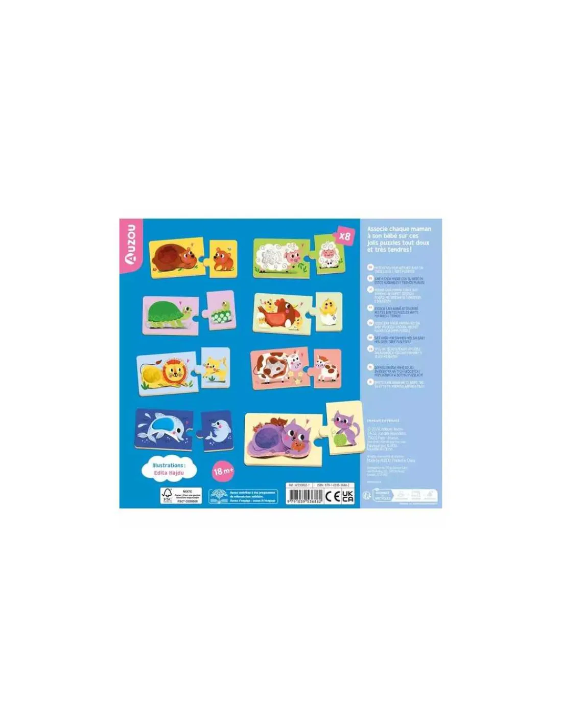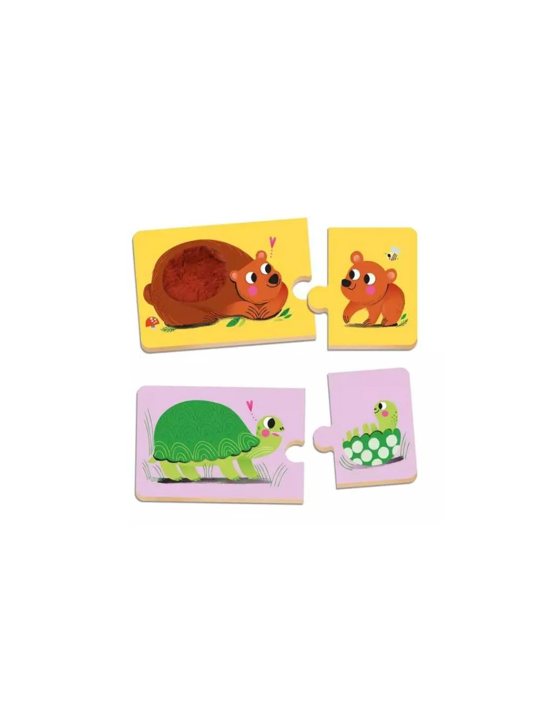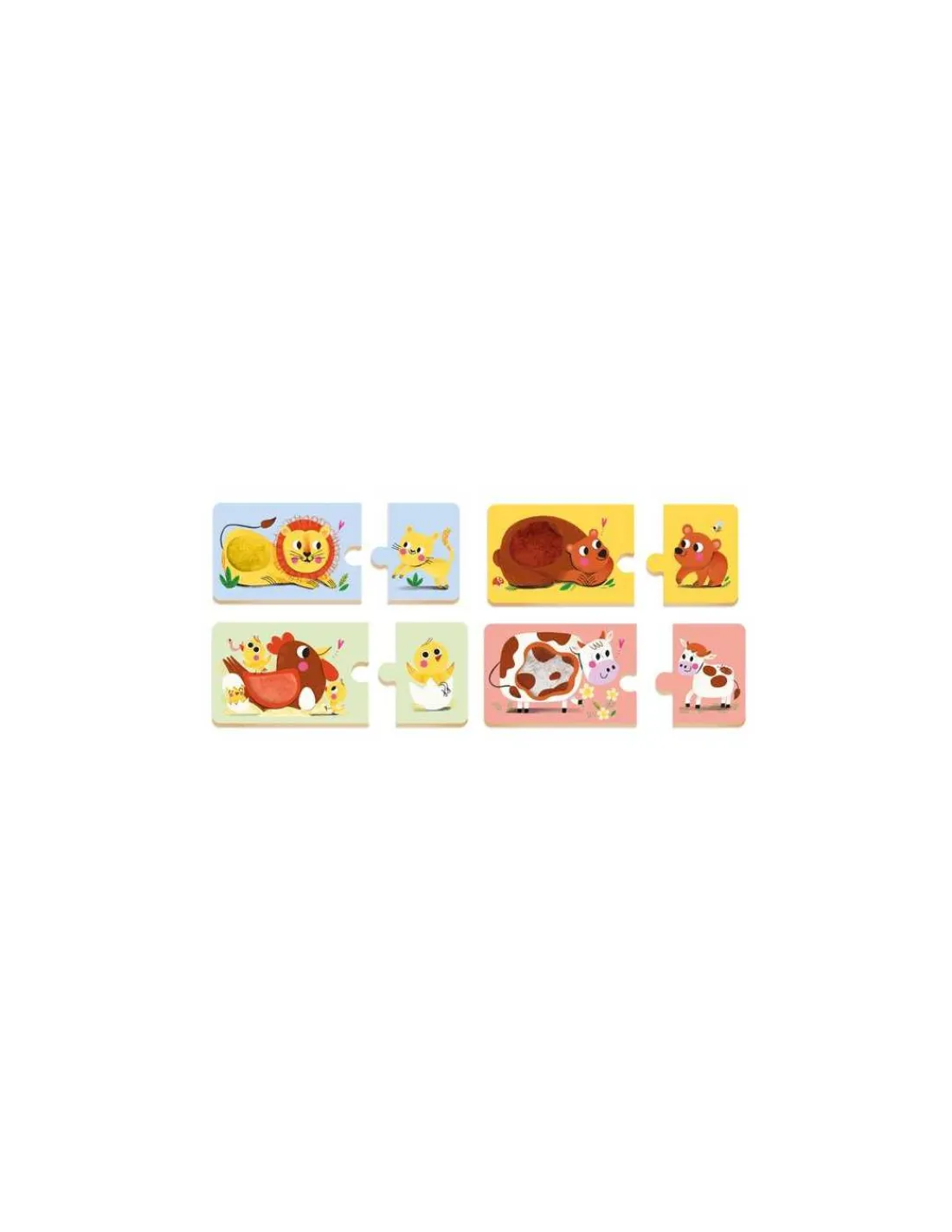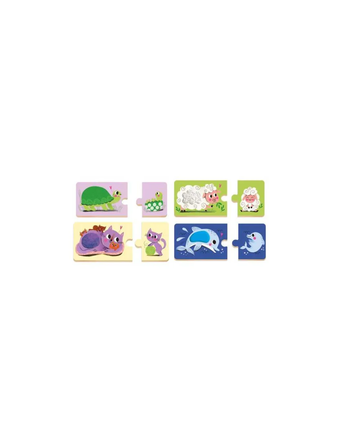L’enfant associe un animal adulte avec son bébé. Les puzzles duo proposent 8 matières à toucher pour éveiller les sens du petit.
