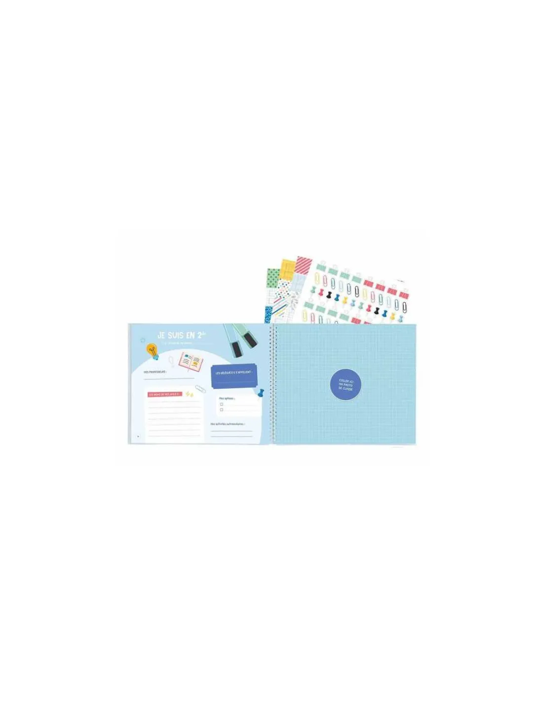Des pages sont prévues pour entrer les informations sur chacune des classes, le nom des professeurs, le nom des établissements… L’album comprend également de jolis autocollants pour fixer les photos à l’album.