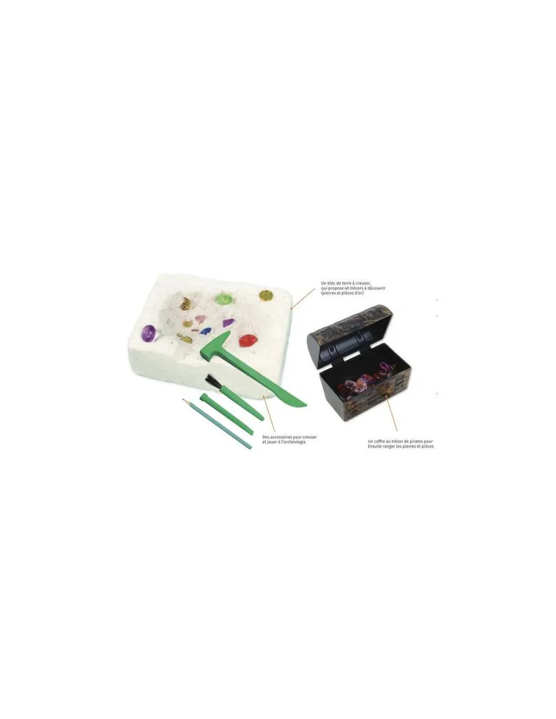 Un super coffret pour déterrer 40 trésors à ranger dans son coffre de pirate ! Un joli coffret d’activité pour s’amuser à déterrer un véritable trésor ! Le coffret est constitué d’un bloc à creuser, d’ustensiles, de 20 pièces d’or, 20 pierres précieuses et d’un livret contenant plein d’informations passionnantes. Les enfants découvrent la géologie mais aussi l’histoire des pirates à travers les âges.